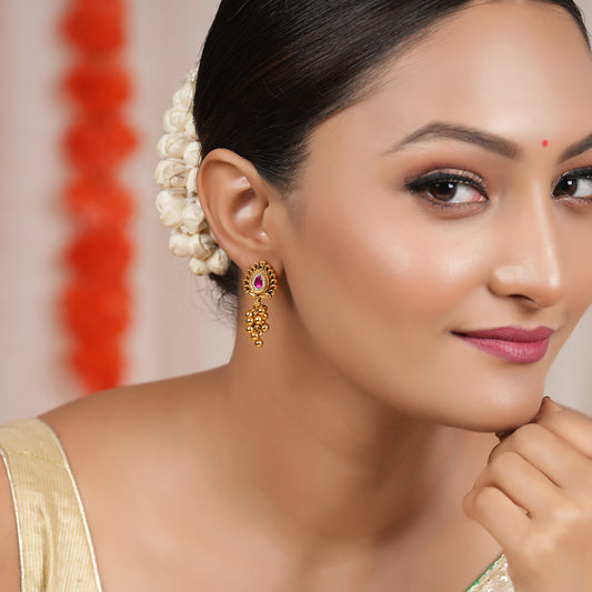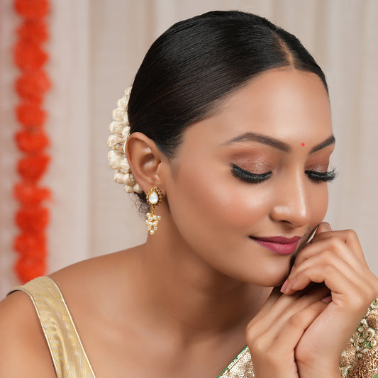 Women who adore the look of gold but don't want to spend a fortune often opt for gold-plated earrings. These earrings are created by coating a base metal, such as brass or copper, with a thin layer of gold. These earrings are made in our jewellery store with only the best components. Our top-notch brass material offers the earrings a better gloss while also extending their lifespan and increasing their toughness. For a durable gold appearance, we also use a 1 micron gold plating method. Our earrings are less expensive than solid gold earrings while maintaining the genuine gold look and feel thanks to the combination of brass and gold plating. From straightforward studs to intricate hoops and danglers, our gold-plated earrings are available in a range of designs. They are an excellent way to add a dash of glitz to any ensemble because they are adaptable and go with both casual and formal attire. Hence, our gold-plated earrings are the ideal option for you if you're looking for a chic and reasonably priced method to add some gold to your jewellery collection!