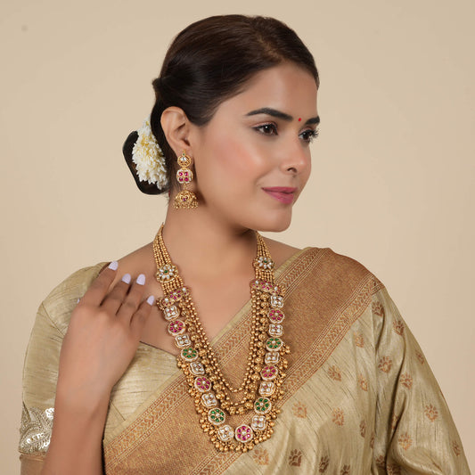 Royal antique gold finish long multicolor kundan necklace set