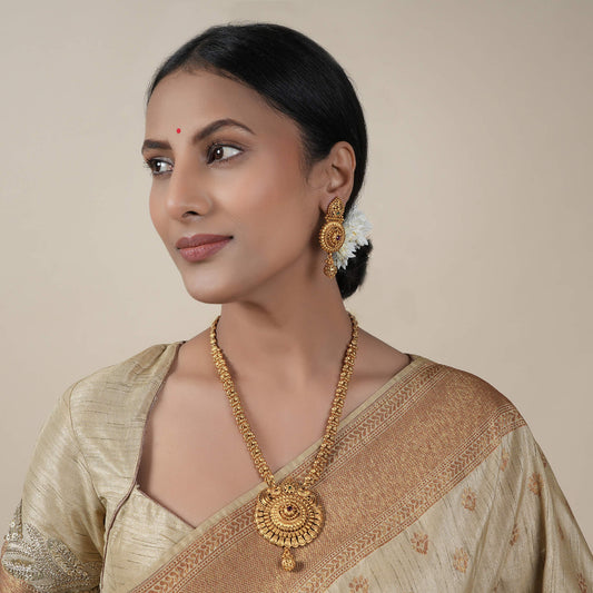 Any necklace that is longer than 20 to 22 inches is categorized as a long necklace. Whereas a rope necklace is one that is longer than 32 inches. Wearing a gold plated long necklace depends on the attire and the occasion like if you have to wear it on a saree try out the temple long necklace or if you want an additional flow of beauty for daily use try our classic gold plated long necklace. But in the end, gold plated long necklaces are typically worn to make a style statement or to celebrate special occasions such as weddings, religious ceremonies, and parties. When you're looking for a long necklace set for women, you're looking for something that gives a focal point to your entire look, so choose a necklace style that complements your attire and the occasion. Gold-plated long necklace sets are versatile jewellery, you can wear these with sarees, lehengas, Anarkali suits, gowns, and tops. They look especially good with plunging or deep necklines. Long necklace sets are often sold with matching earrings and are available in a variety of styles and designs. Long necklace sets composed of precious metals can be expensive, as can counterfeit gold or oxidized long necklace sets. This is not achievable with genuine lengthy necklace sets. Currently, gold plated long necklace sets are so wonderfully designed that it is difficult to tell the difference between real and imitation jewellery.