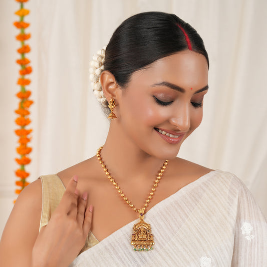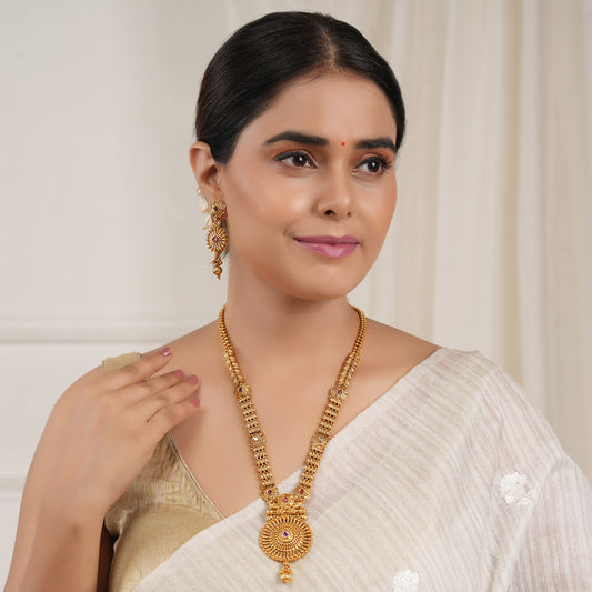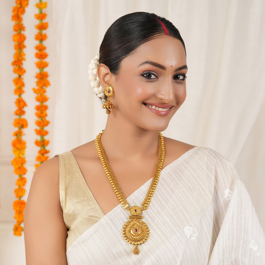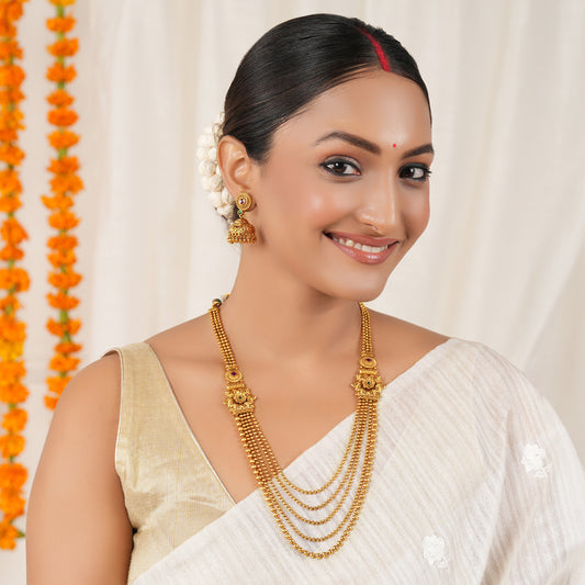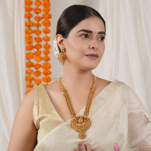 Any necklace that is longer than 20 to 22 inches is categorized as a long necklace. Whereas a rope necklace is one that is longer than 32 inches. Wearing a gold plated long necklace depends on the attire and the occasion like if you have to wear it on a saree try out the temple long necklace or if you want an additional flow of beauty for daily use try our classic gold plated long necklace. But in the end, gold plated long necklaces are typically worn to make a style statement or to celebrate special occasions such as weddings, religious ceremonies, and parties. When you're looking for a long necklace set for women, you're looking for something that gives a focal point to your entire look, so choose a necklace style that complements your attire and the occasion. Gold-plated long necklace sets are versatile jewellery, you can wear these with sarees, lehengas, Anarkali suits, gowns, and tops. They look especially good with plunging or deep necklines. Long necklace sets are often sold with matching earrings and are available in a variety of styles and designs. Long necklace sets composed of precious metals can be expensive, as can counterfeit gold or oxidized long necklace sets. This is not achievable with genuine lengthy necklace sets. Currently, gold plated long necklace sets are so wonderfully designed that it is difficult to tell the difference between real and imitation jewellery.