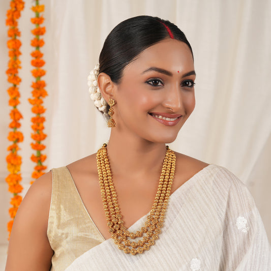 Any necklace that is longer than 20 to 22 inches is categorized as a long necklace. Whereas a rope necklace is one that is longer than 32 inches. Wearing a gold plated long necklace depends on the attire and the occasion like if you have to wear it on a saree try out the temple long necklace or if you want an additional flow of beauty for daily use try our classic gold plated long necklace. But in the end, gold plated long necklaces are typically worn to make a style statement or to celebrate special occasions such as weddings, religious ceremonies, and parties. When you're looking for a long necklace set for women, you're looking for something that gives a focal point to your entire look, so choose a necklace style that complements your attire and the occasion. Gold-plated long necklace sets are versatile jewellery, you can wear these with sarees, lehengas, Anarkali suits, gowns, and tops. They look especially good with plunging or deep necklines. Long necklace sets are often sold with matching earrings and are available in a variety of styles and designs. Long necklace sets composed of precious metals can be expensive, as can counterfeit gold or oxidized long necklace sets. This is not achievable with genuine lengthy necklace sets. Currently, gold plated long necklace sets are so wonderfully designed that it is difficult to tell the difference between real and imitation jewellery.