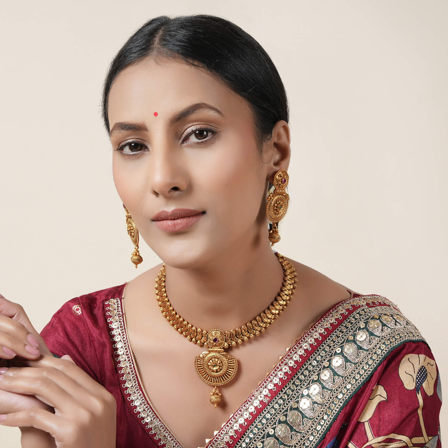 NOTE: Amazing antique gold finish necklace set with earrings is has been crafted by hand and may have slight irregularities or imperfections in color or embellishment. These irregularities are the result of human involvement in the process and add to the finished product's charm while ensuring you have a one-of-a-kind piece.