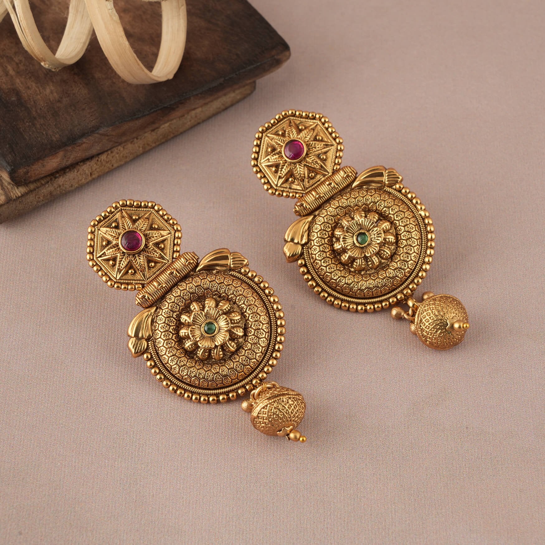 Amazing antique gold finish necklace set with earrings  is made of brass alloy with gold plating. The necklace length is 20 inches, and the necklace lock is Drawing String The earrings are 2.5 inch long, and its lock is a push-back. This set comes with beautiful pair of matching earrings Amazing antique gold finish necklace set with earrings  is a show-stopping, traditional Indian necklace set with gold plating and handwork. Buy this Amazing antique gold finish necklace set with earrings  is and get free shipping even on Cash on Delivery