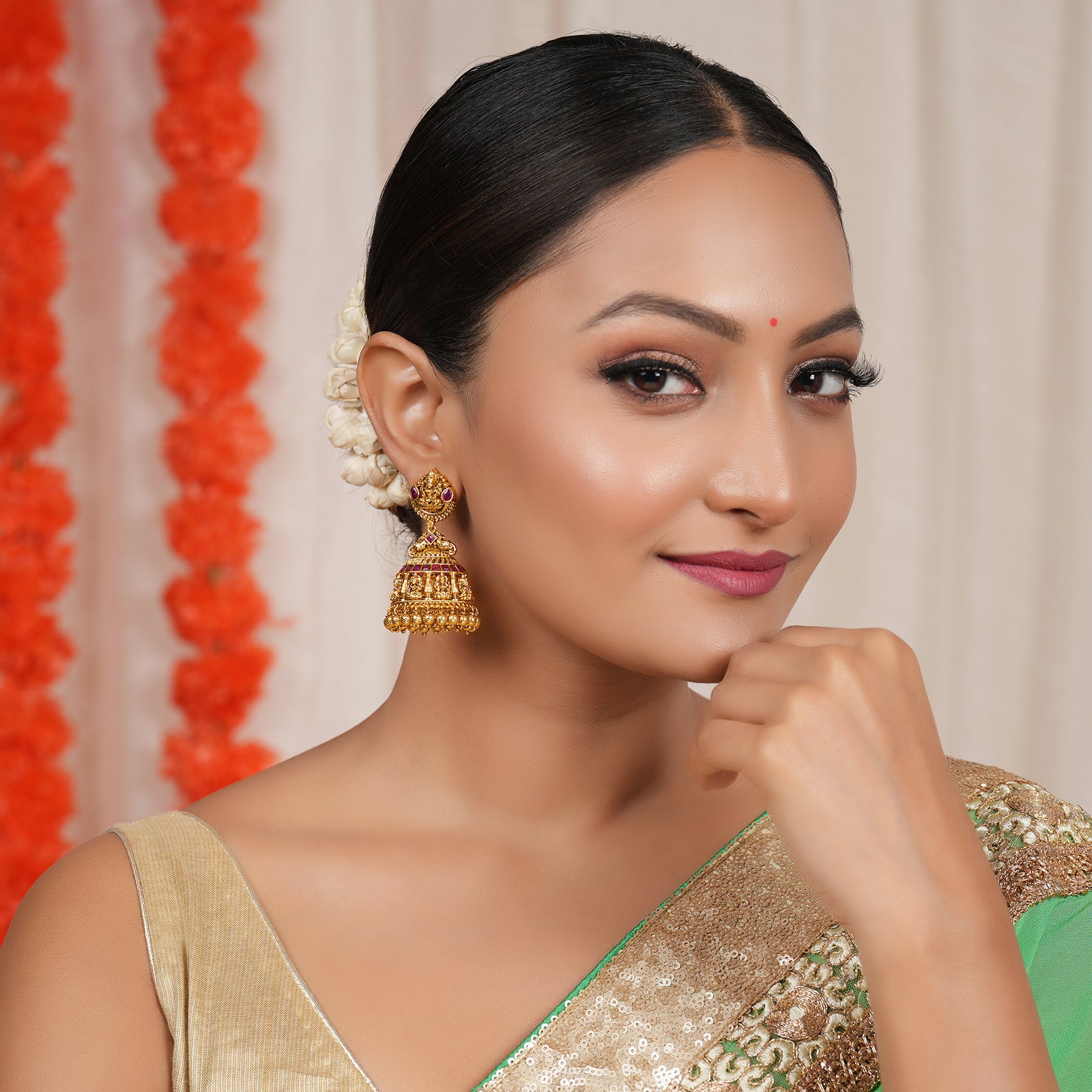 NOTE: These Amazing antique gold ma lakhsmi ruby jhumka earring  has been crafted by hand and may have slight irregularities or imperfections in colour or embellishment. These irregularities are the result of human involvement in the process and add to the finished product's charm while ensuring you have a one-of-a-kind piece.
