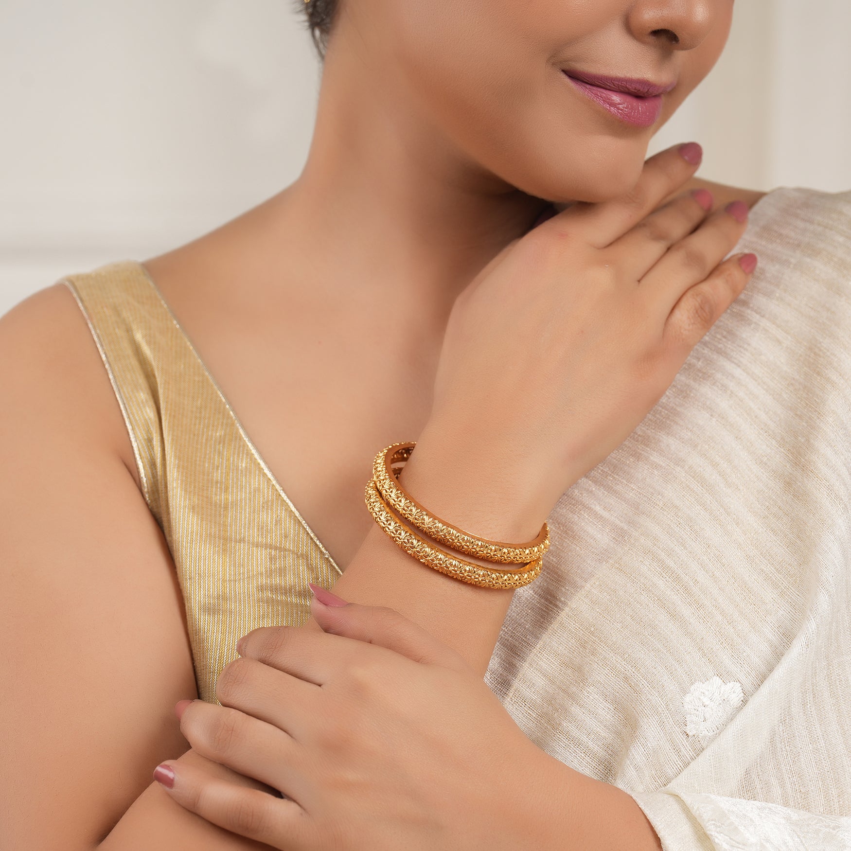 NOTE: This Amazing antique gold plated carved bangle set has been crafted by hand and may have slight irregularities or imperfections in color or embellishment.