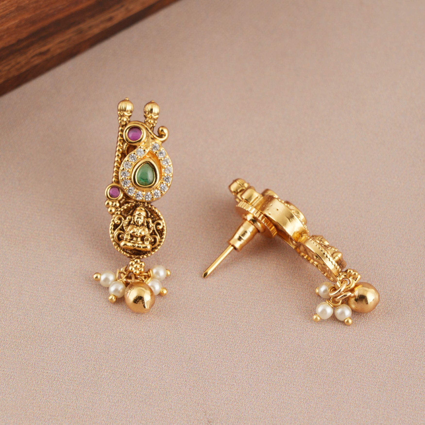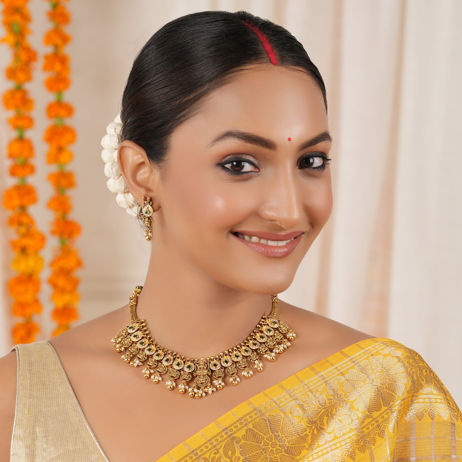 NOTE: Amazing Antique gold stone ma lakshmi necklace set I Temple Jewellery is has been crafted by hand and may have slight irregularities or imperfections in color or embellishment. These irregularities are the result of human involvement in the process and add to the finished product's charm while ensuring you have a one-of-a-kind piece.