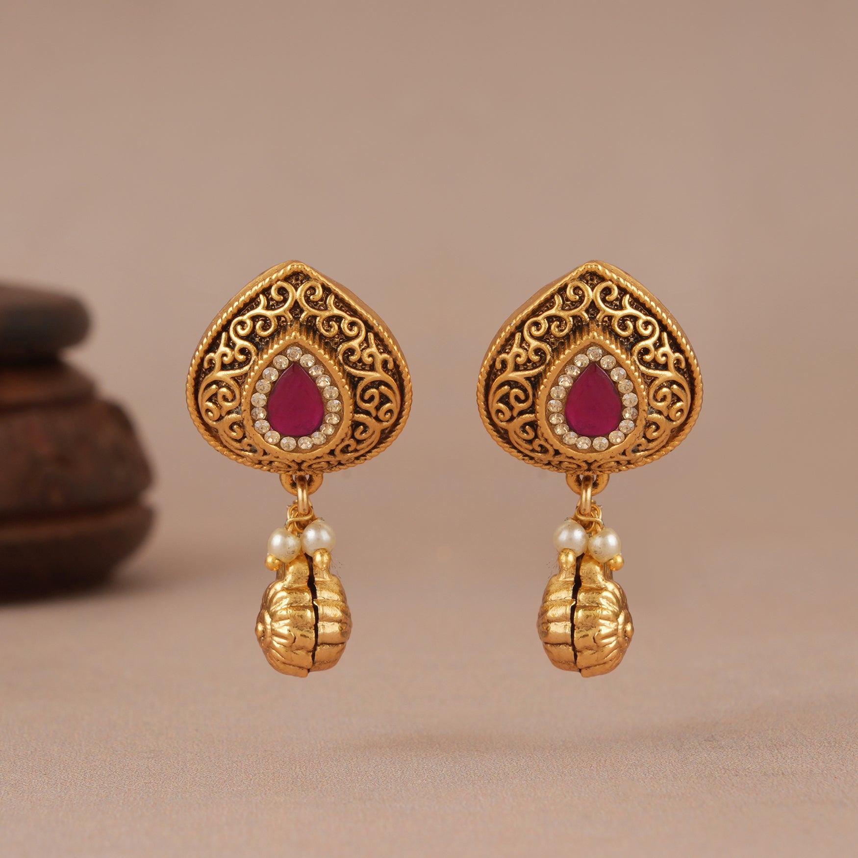 Amazing antique gold traditional stone earring   of brass alloy with gold plating. These earrings are 1.1  inches long, and the lock is push back. Amazing antique gold traditional stone earring   show-stopping and come in traditional  Indian   design with gold plating and handwork.