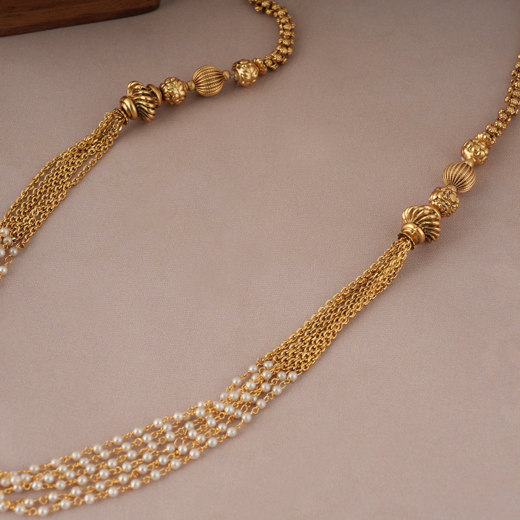 Amazing long pearl drop antique gold mala  is made of brass alloy with gold plating. The necklace length is 24 inches, and the necklace lock is hook.
