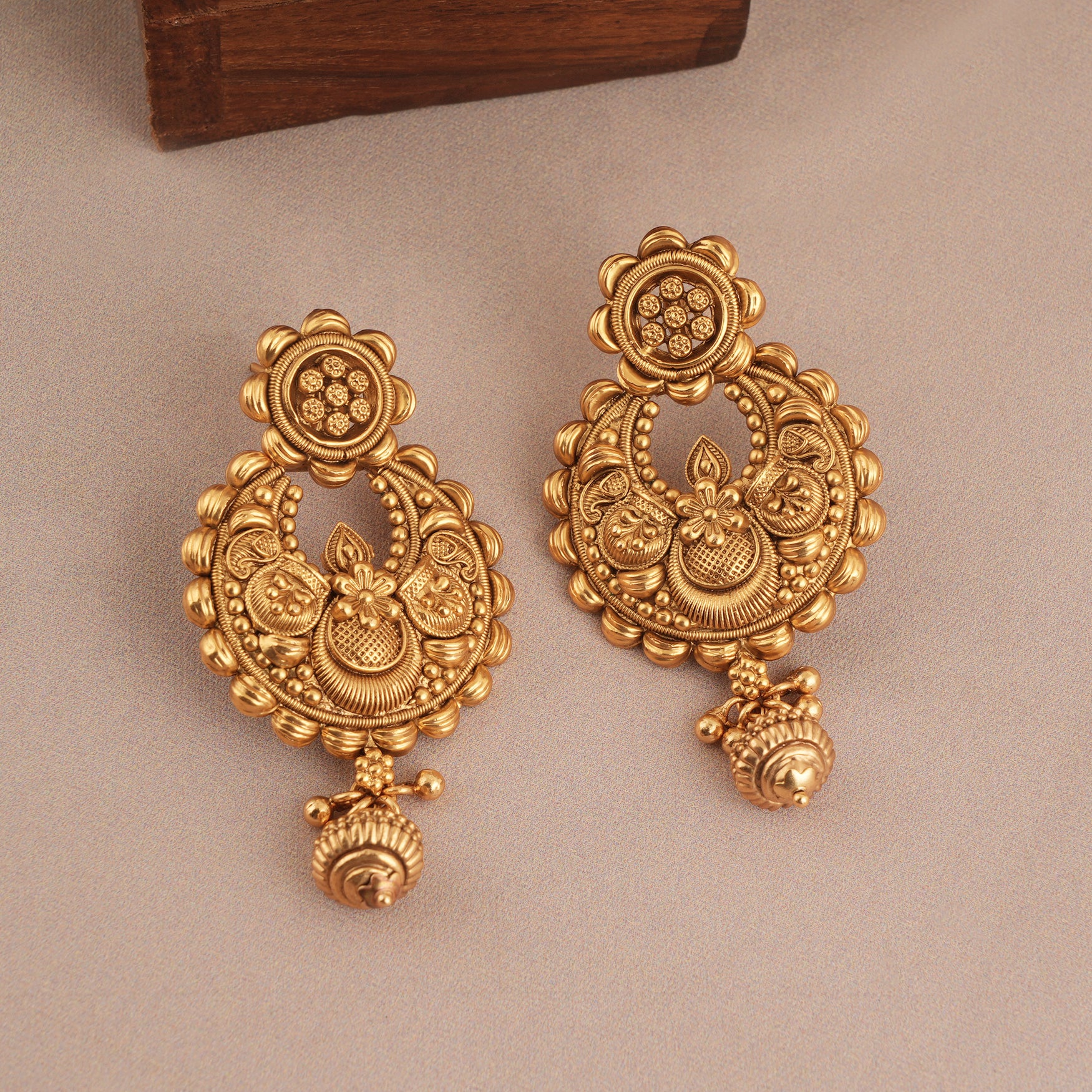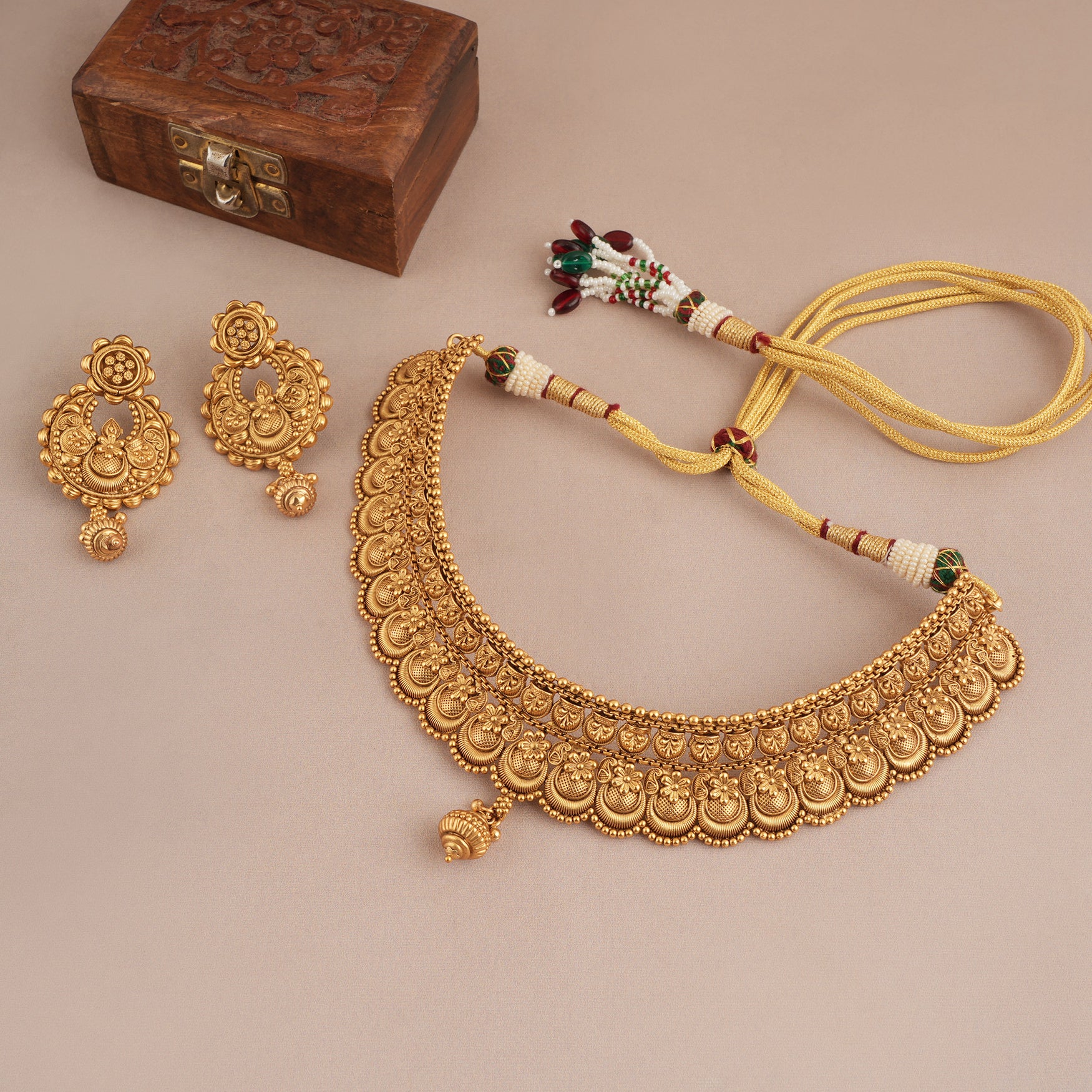 Amazing plain antique gold traditional choker necklace set are show-stopping and come in traditional Indian design with gold plating and handwork.