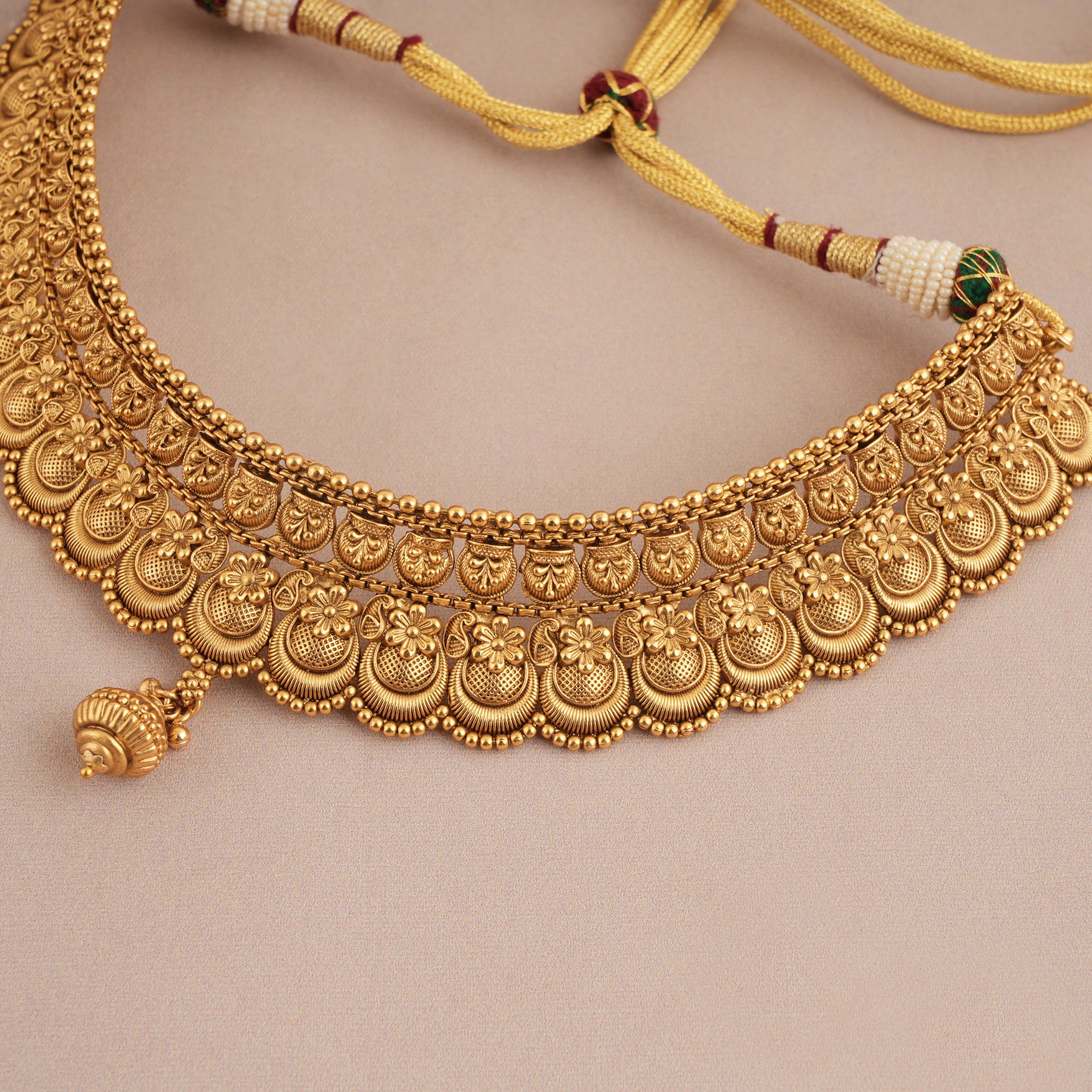 NOTE: These Amazing plain antique gold traditional choker necklace set have been crafted by hand and may have slight irregularities or imperfections in color or embellishment. These irregularities are the result of human involvement in the process and add to the finished product's charm while ensuring you have a one-of-a-kind piece.