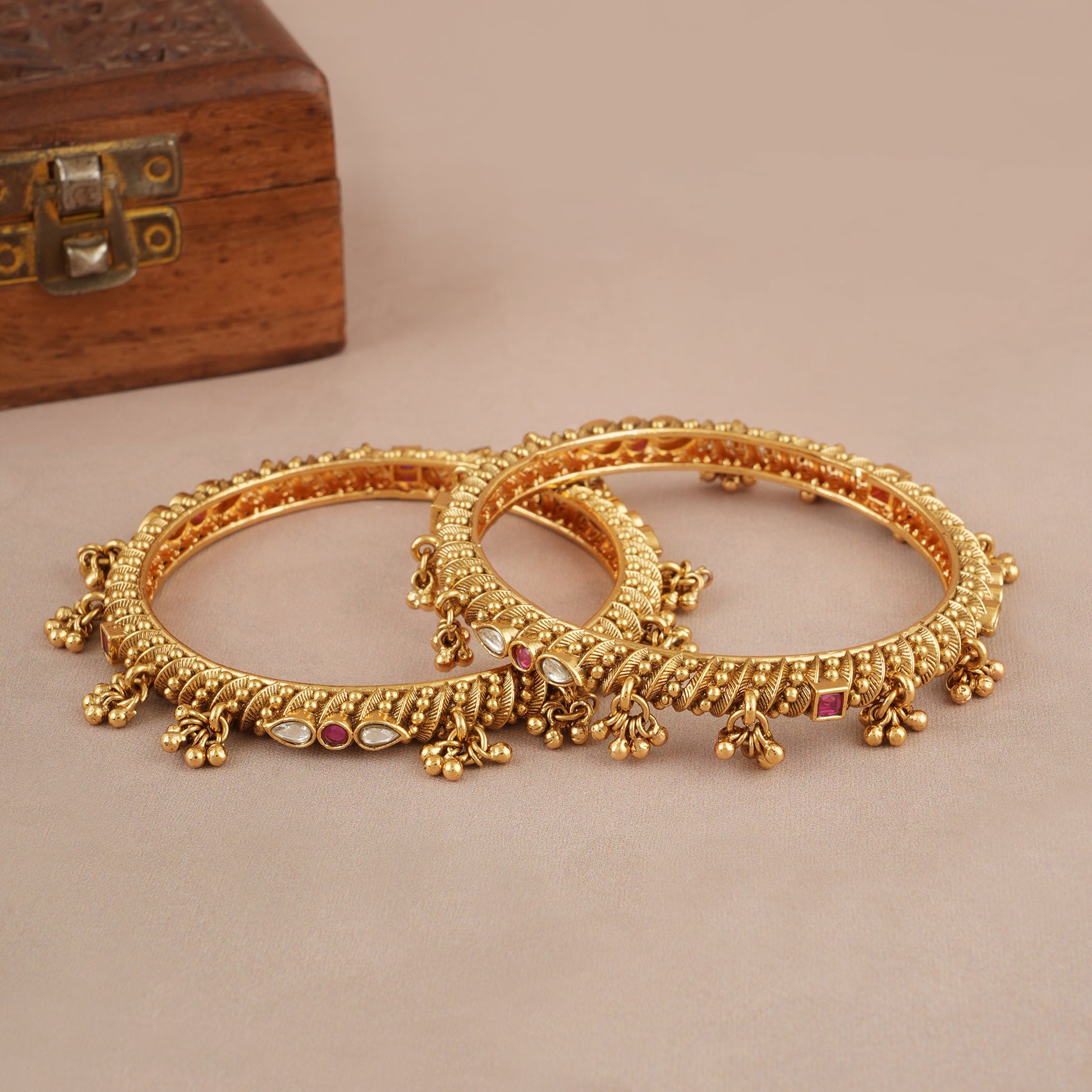 NOTE: This Amazing stone kundan gold ghungroo bangle set has been crafted by hand and may have slight irregularities or imperfections in color or embellishment.