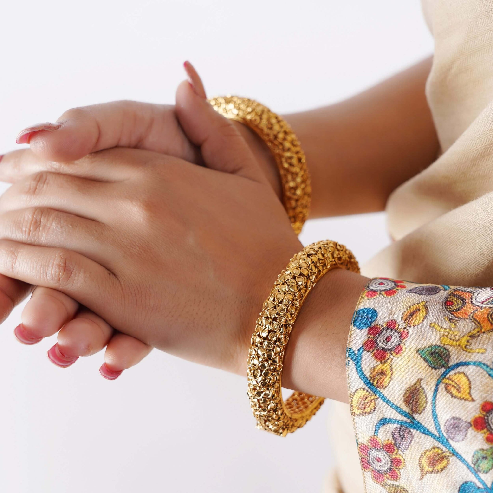NOTE: This Antique gold leaf bangle set has been crafted by hand and may have slight irregularities or imperfections in color or embellishment. These irregularities are the result of human involvement in the process and add to the finished product's charm while ensuring you have a one-of-a-kind piece.