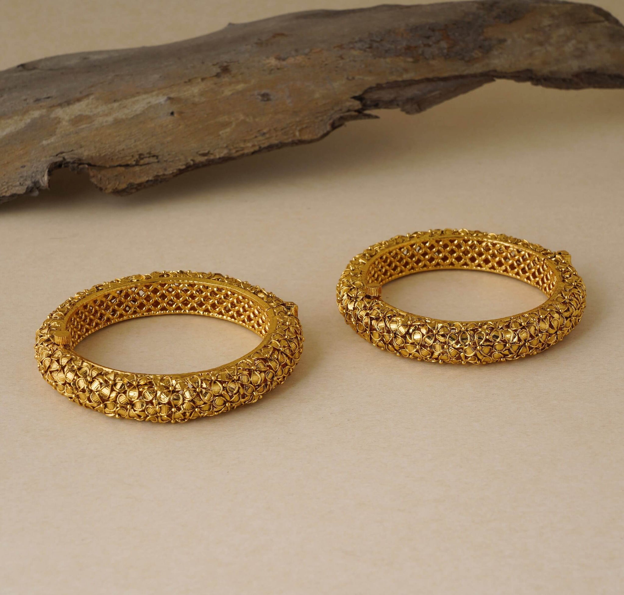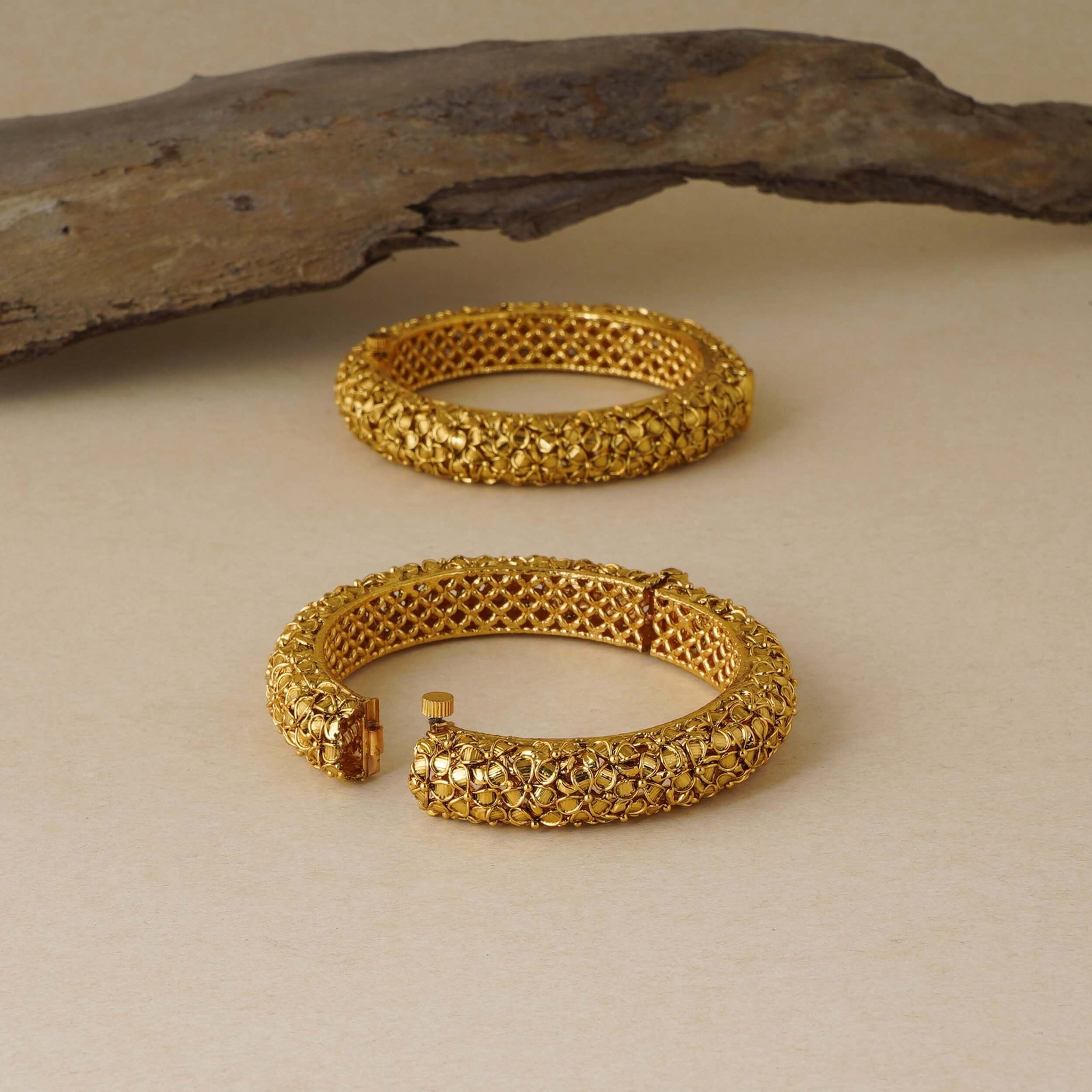 Antique gold leaf bangle set is a timeless piece that will provide you with years of beautiful wear. The metal-brass alloy with gold plating is made to last.   This Antique gold leaf bangle set is show-stopping and comes in traditional Indian design with gold plating and handwork.   Buy Antique gold leaf bangle set online and get free shipping even on Cash on Delivery