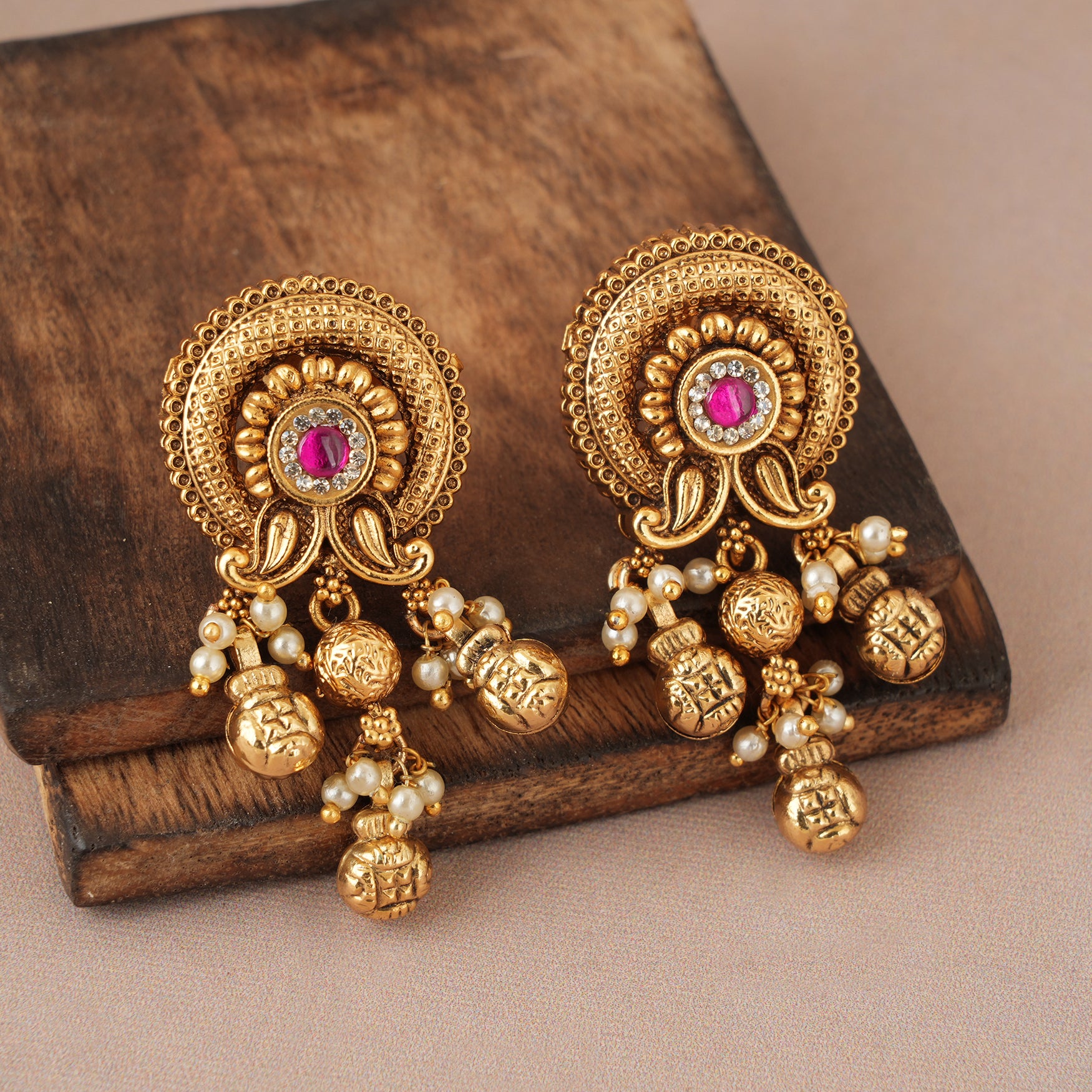 Antique gold long traditional stone earring    of brass alloy with gold plating. These earrings are  2.2 inches long, and the lock is push back. Antique gold long traditional stone earring    show-stopping and come in traditional  Indian   design with gold plating and handwork.