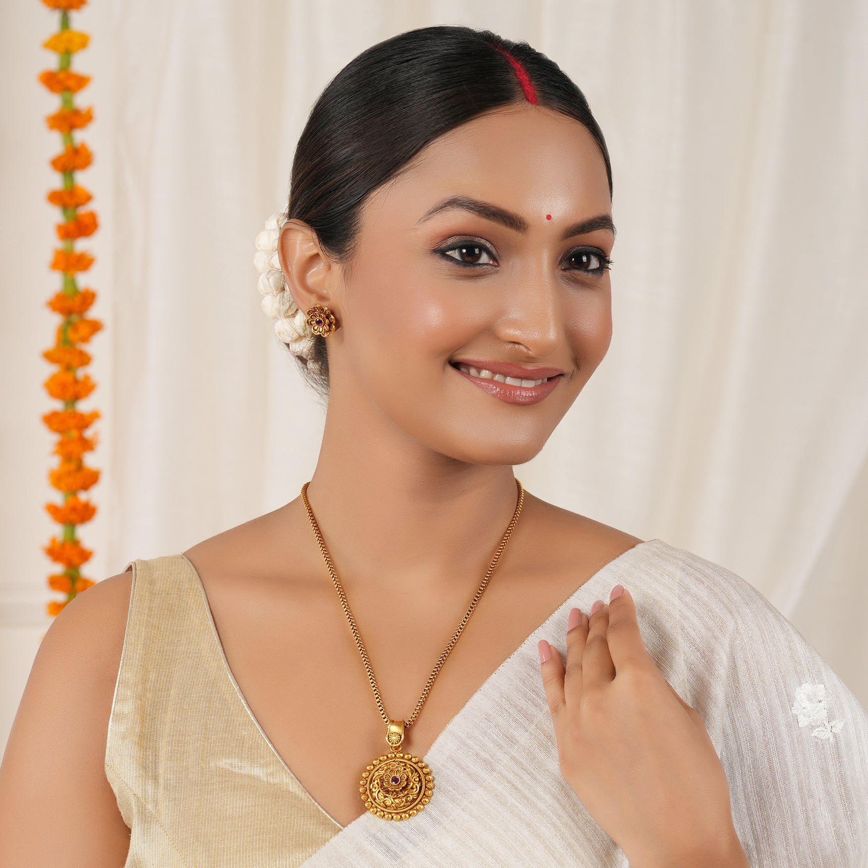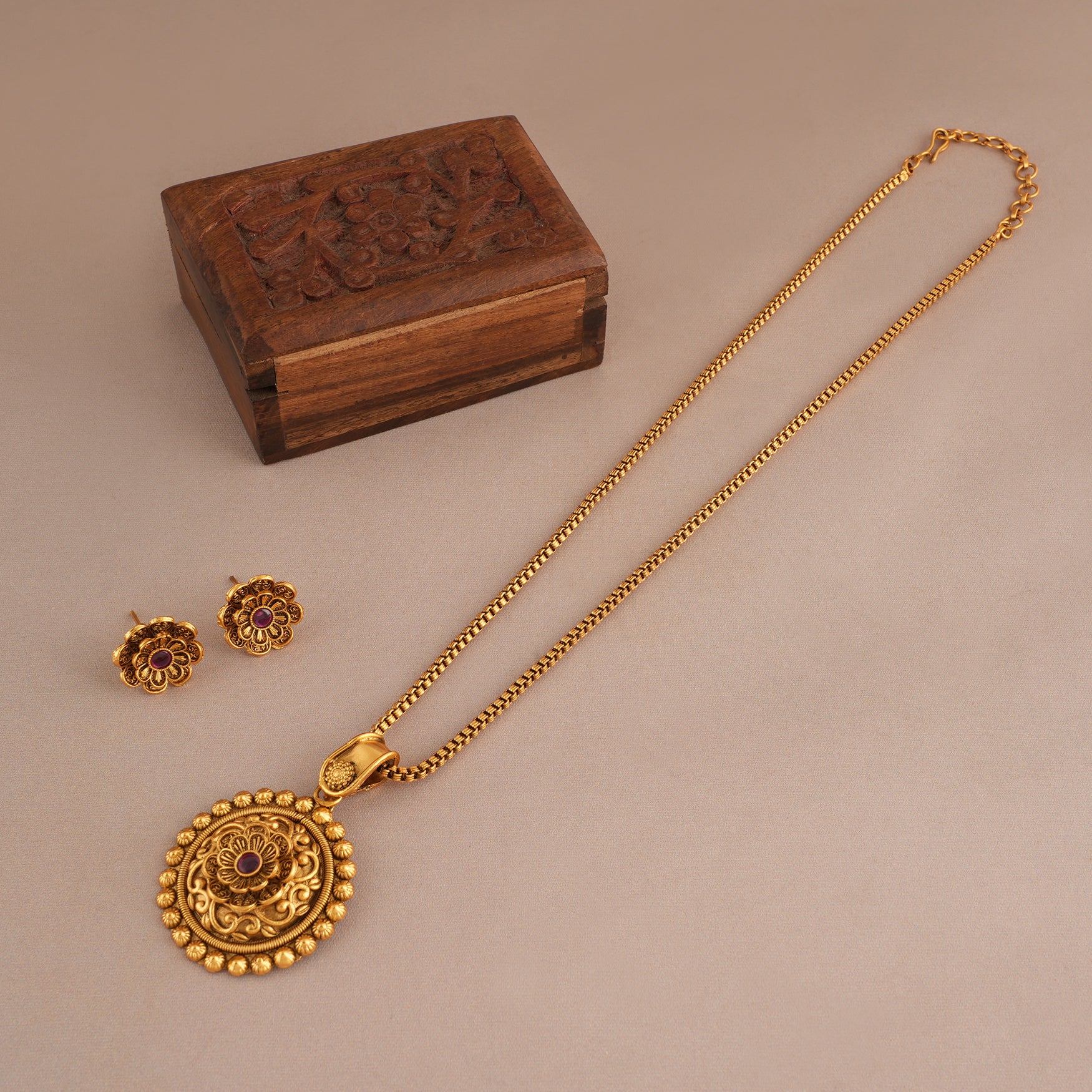 NOTE: This Antique gold plated floral pendant set has been crafted by hand and may have slight irregularities or imperfections in color or embellishment. These irregularities are the result of human involvement in the process and add to the finished product's charm while ensuring you have a one-of-a-kind piece.