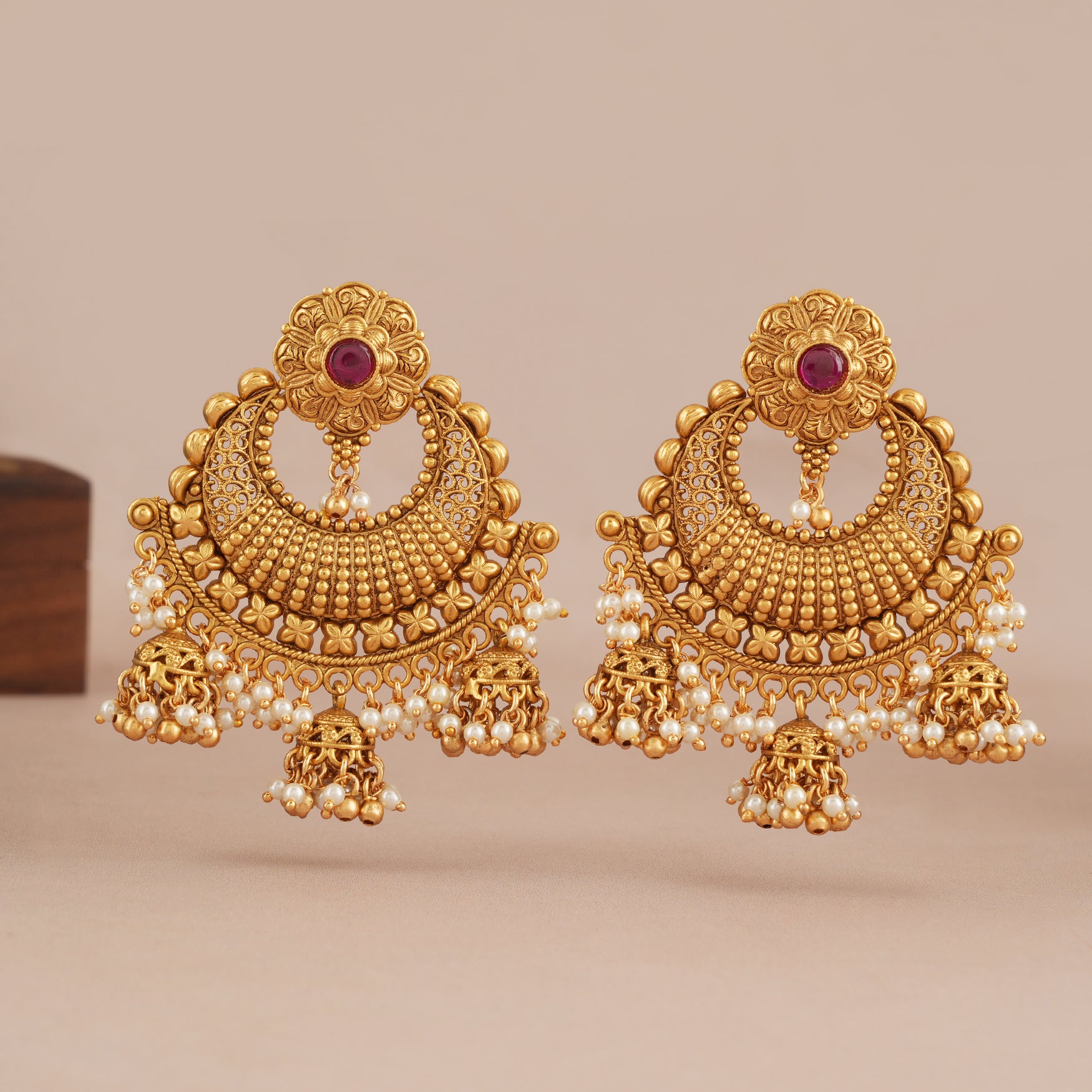 NOTE: These Antique gold stunning chandbali pearl earring have been crafted by hand and may have slight irregularities or imperfections in color or embellishment. These irregularities are the result of human involvement in the process and add to the finished product's charm while ensuring you have a one-of-a-kind piece.