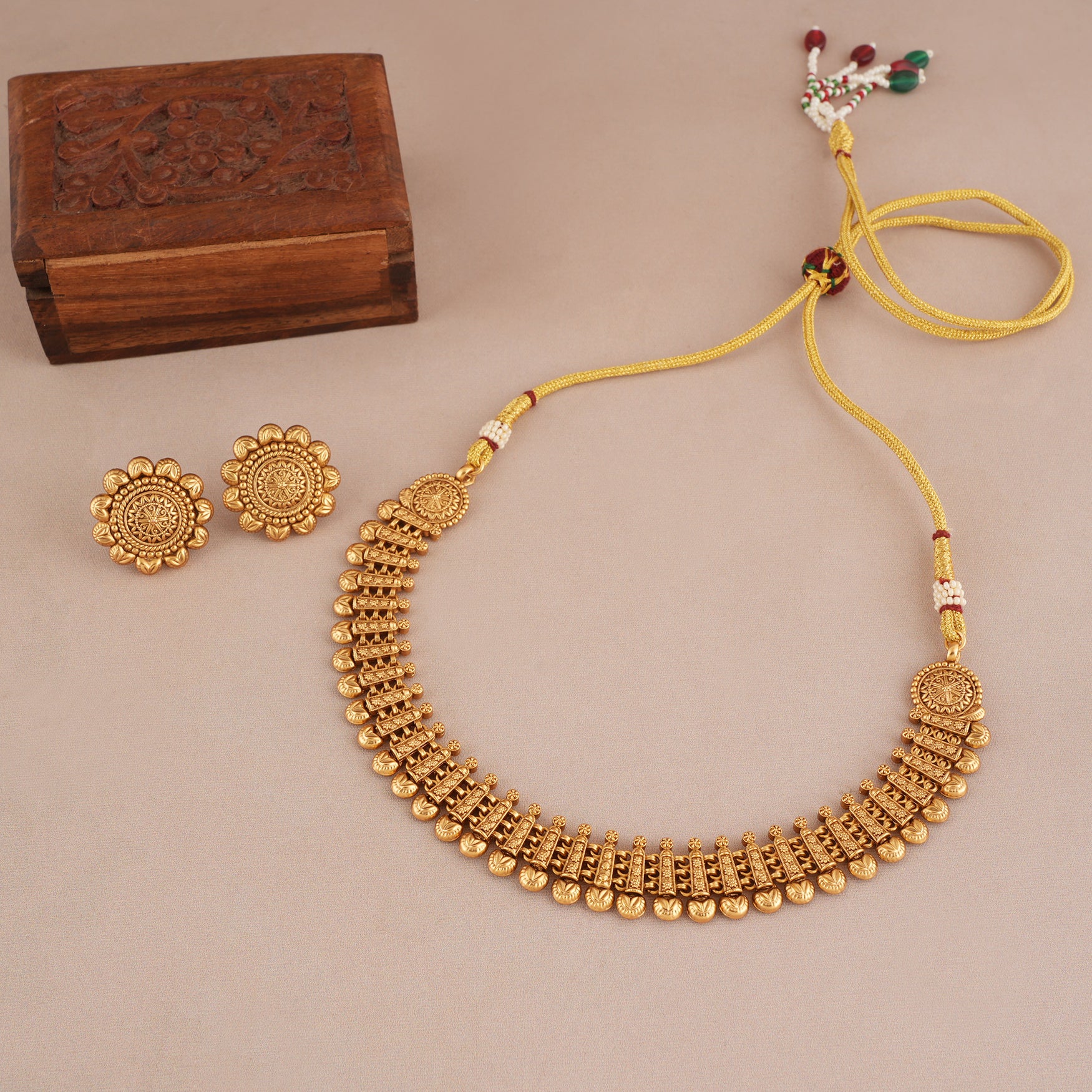 NOTE: These Antique plain gold traditional necklace set have been crafted by hand and may have slight irregularities or imperfections in color or embellishment. These irregularities are the result of human involvement in the process and add to the finished product's charm while ensuring you have a one-of-a-kind piece.