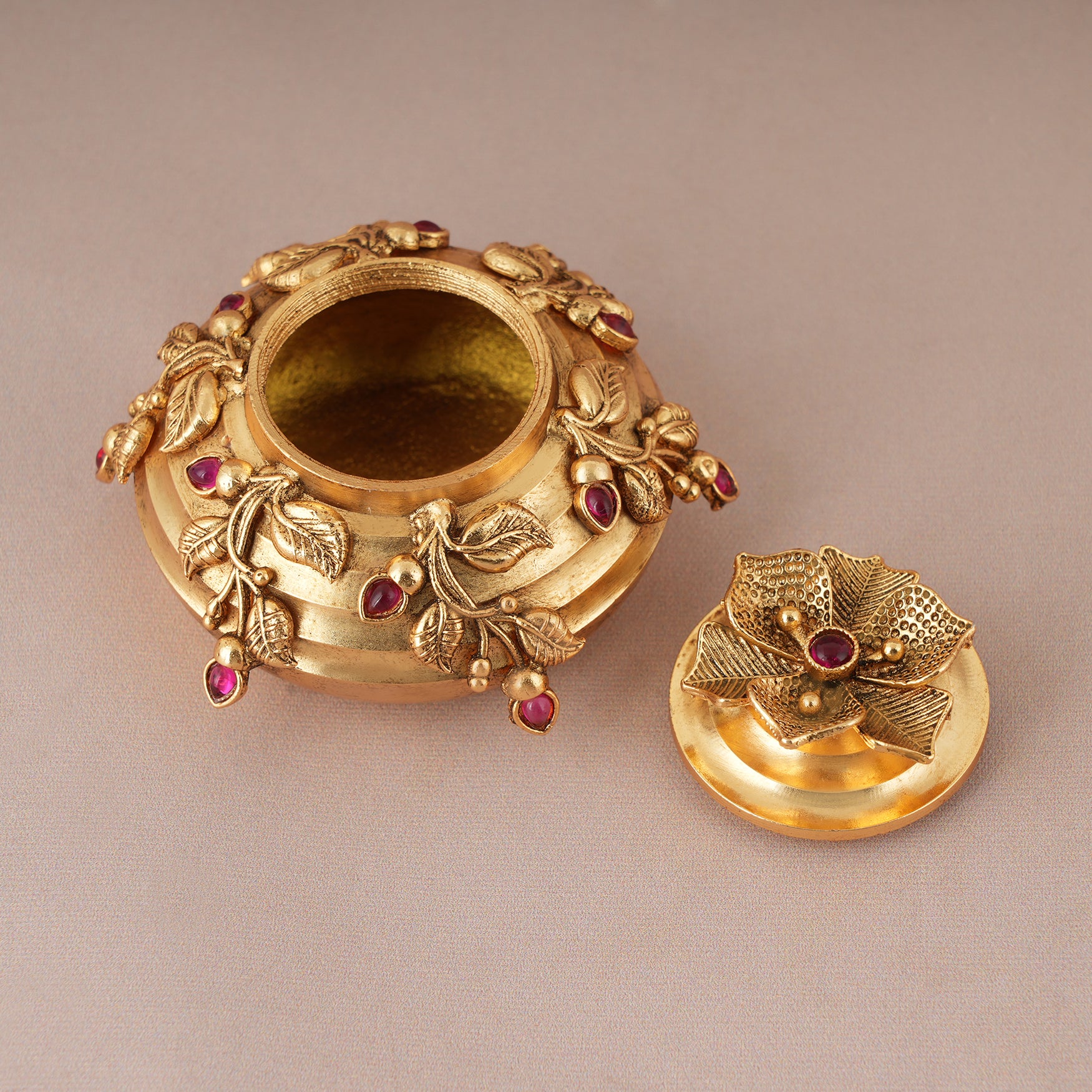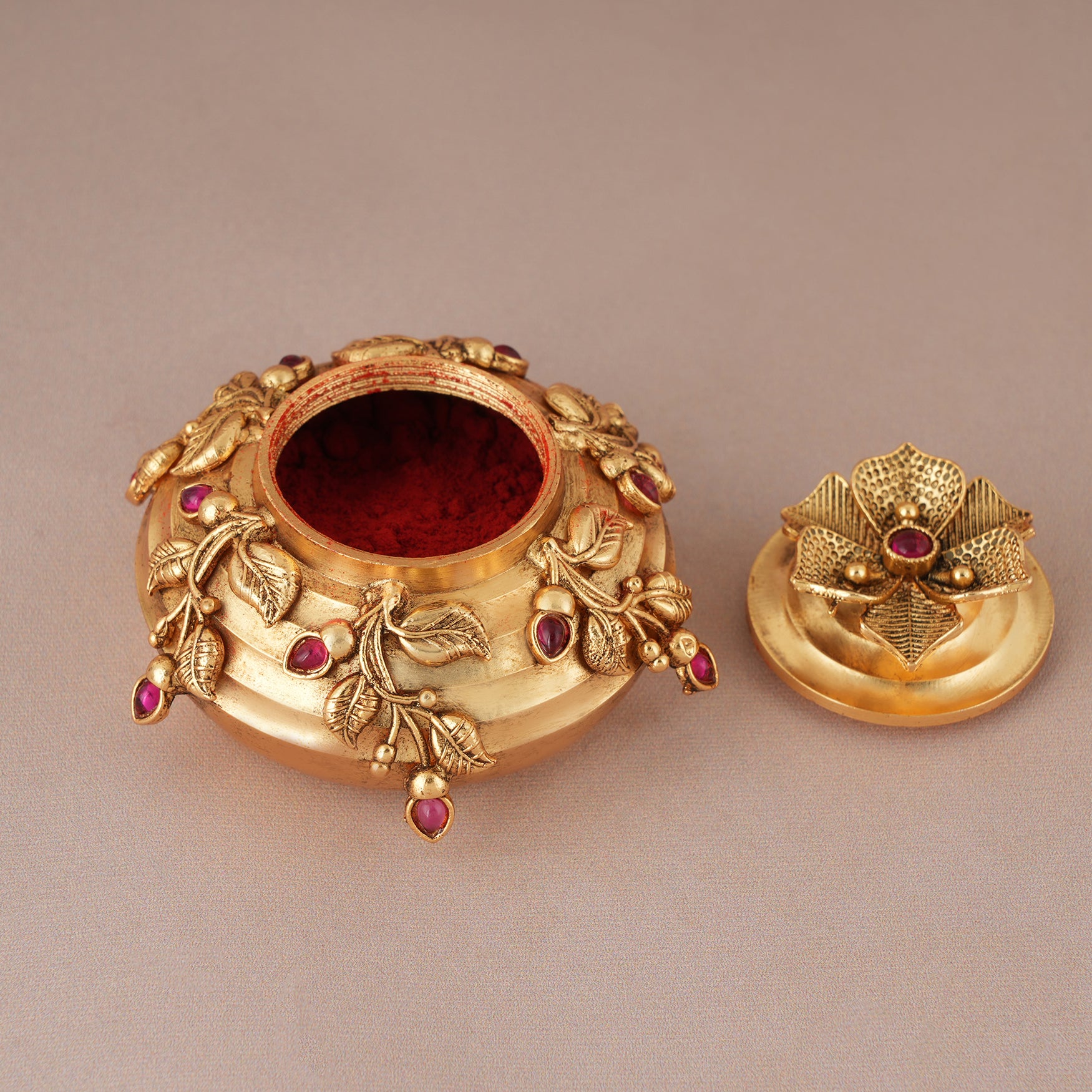 NOTE: This Stunning leaf gold plated sindoor box have been crafted by hand and may have slight irregularities or imperfections in color or embellishment. These irregularities are the result of human involvement in the process and add to the finished product's charm while ensuring you have a one-of-a-kind piece.