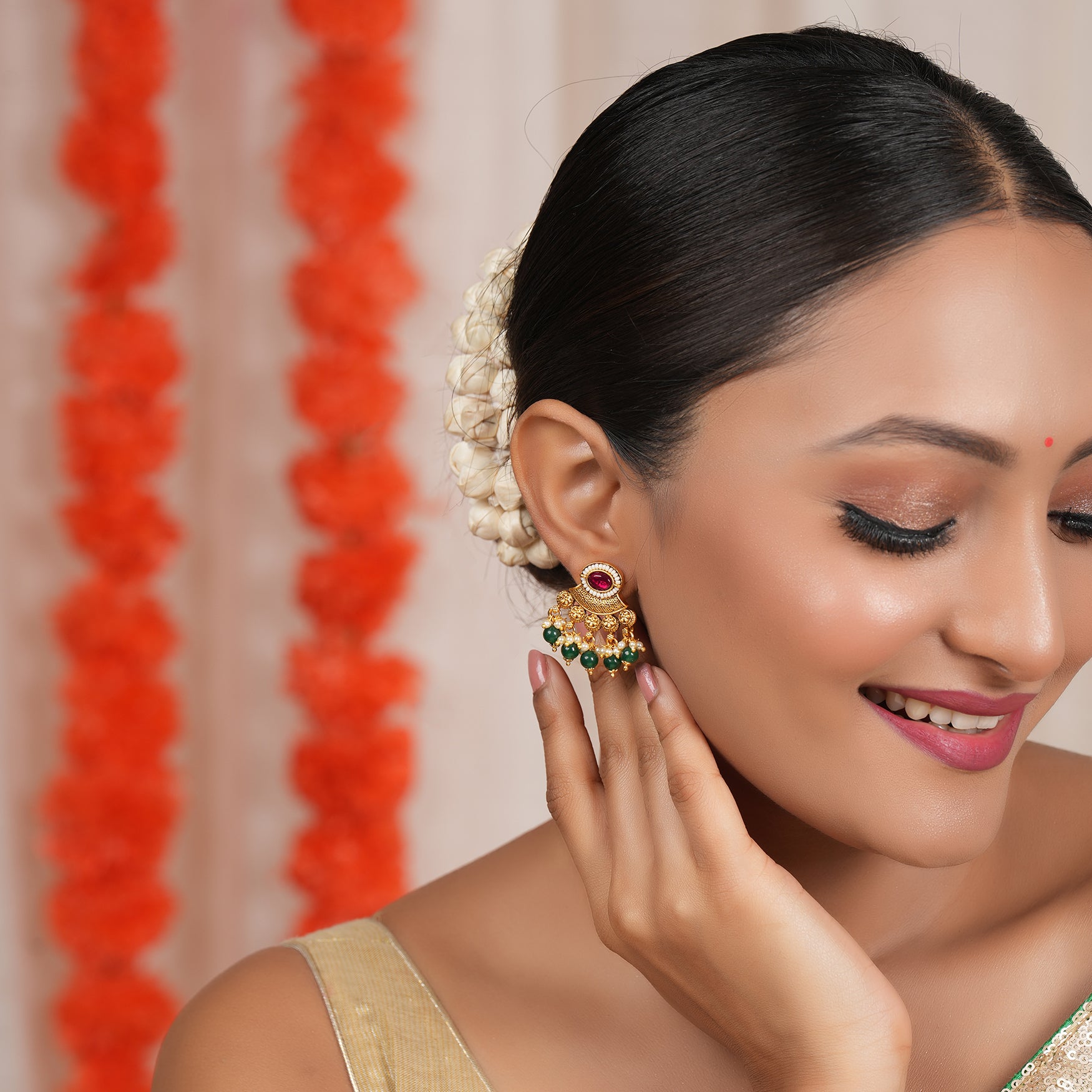 Beautiful antique gold green stone drop earring    of brass alloy with gold plating. These earrings are  1.3 inches long, and the lock is push back. Beautiful antique gold green stone drop earring    show-stopping and come in traditional  Indian   design with gold plating and handwork.