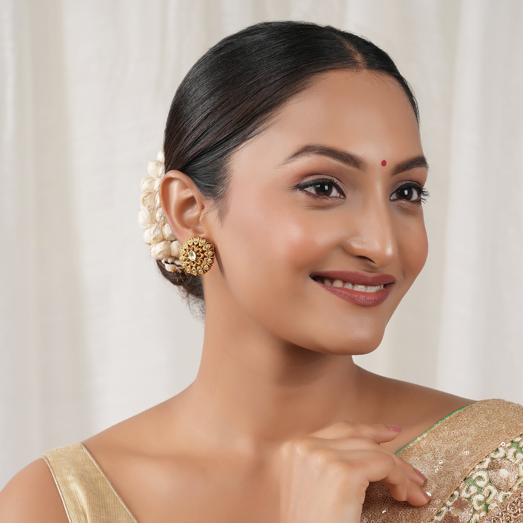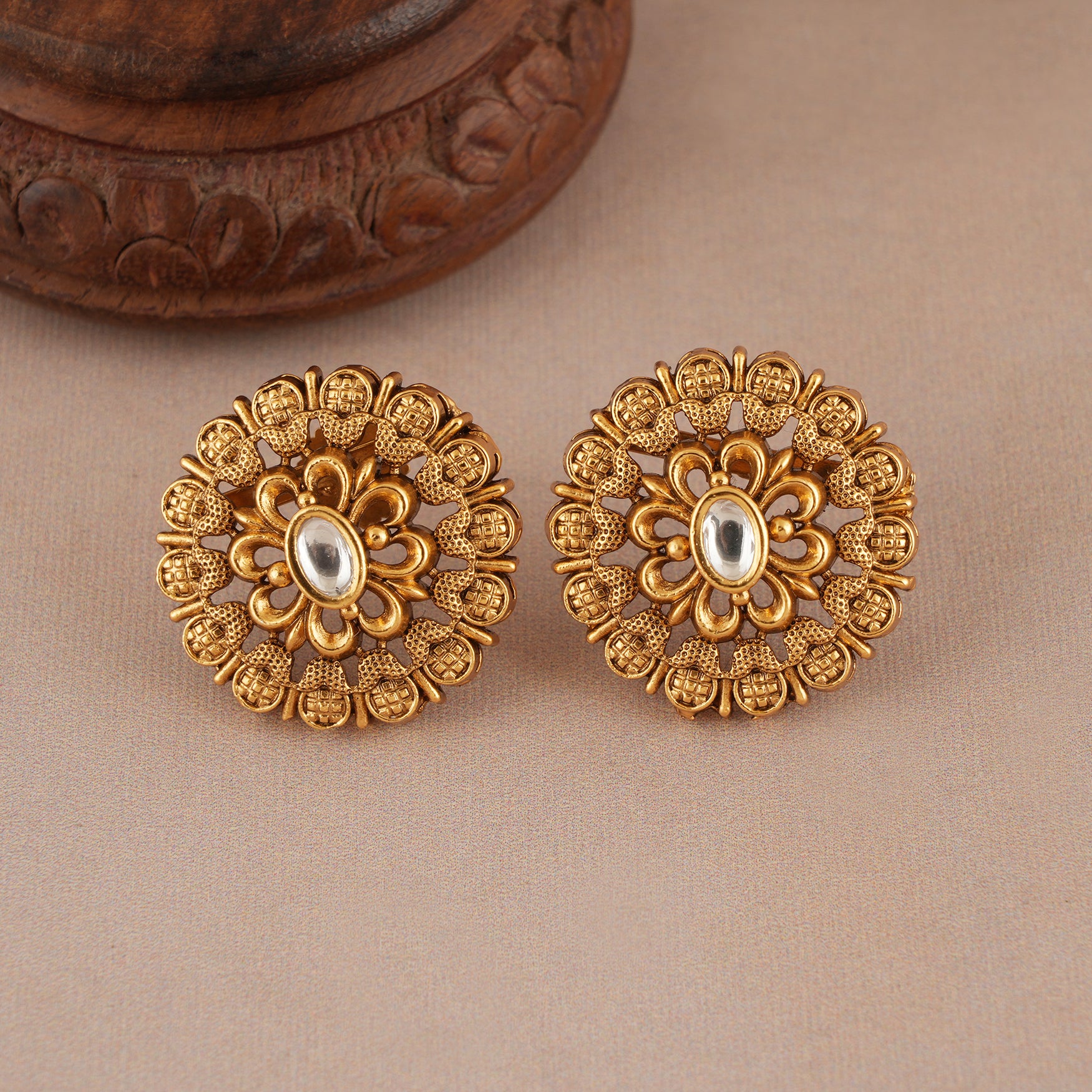 NOTE: These  Beautiful antique gold kundan floral stud earring    been crafted by hand and may have slight irregularities or imperfections in colour or embellishment. These irregularities are the result of human involvement in the process and add to the finished product's charm while ensuring you have a one-of-a-kind piece.