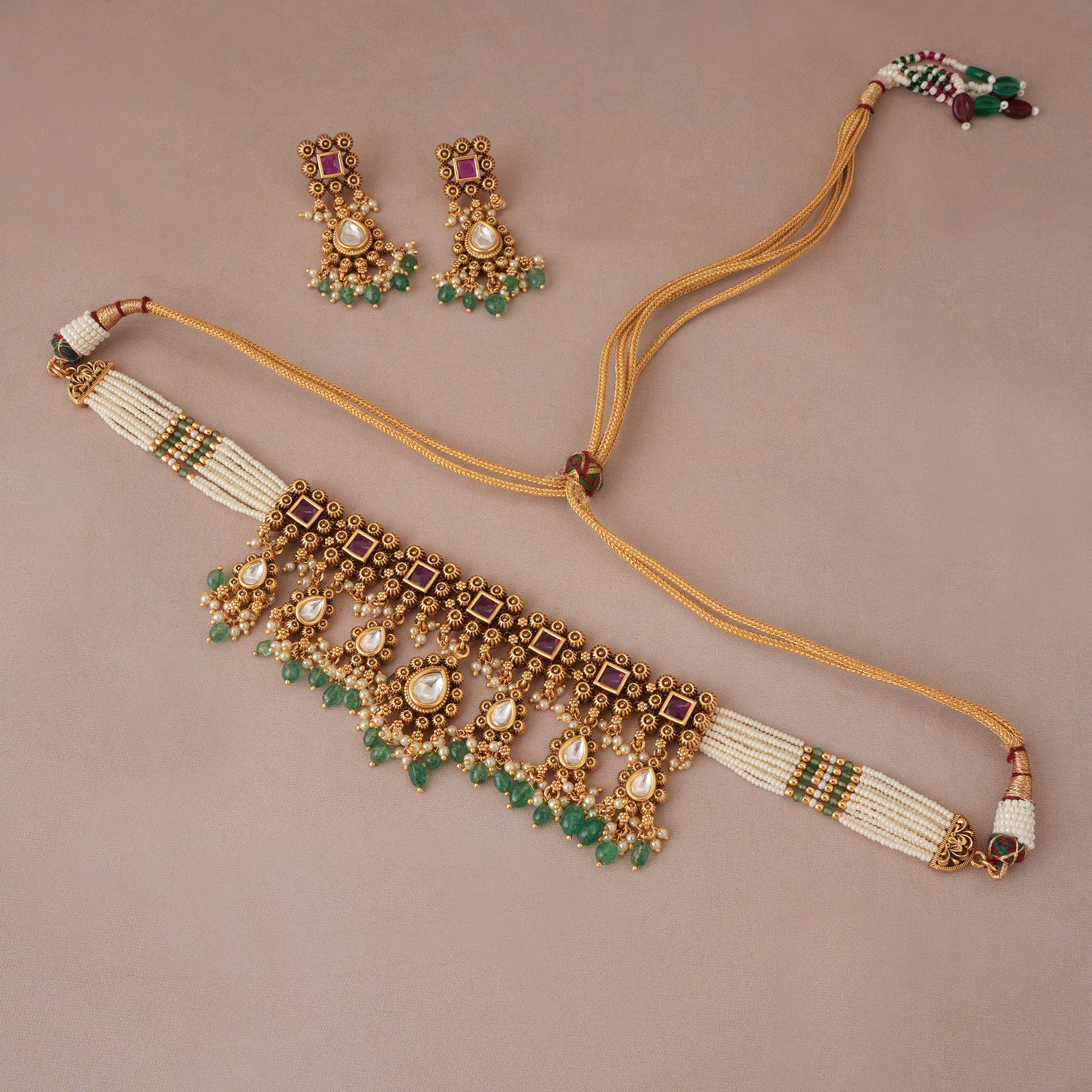 Buy Beautiful antique gold kundan stone choker necklace set and get free shipping even on Cash on Delivery.