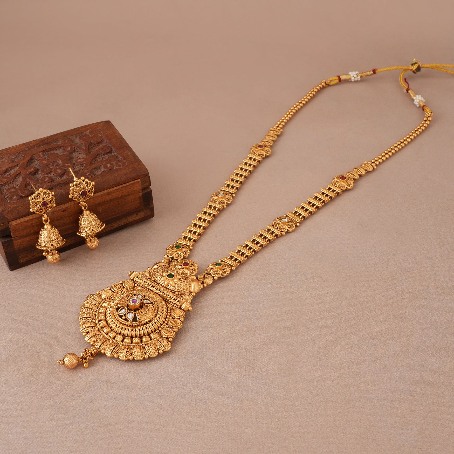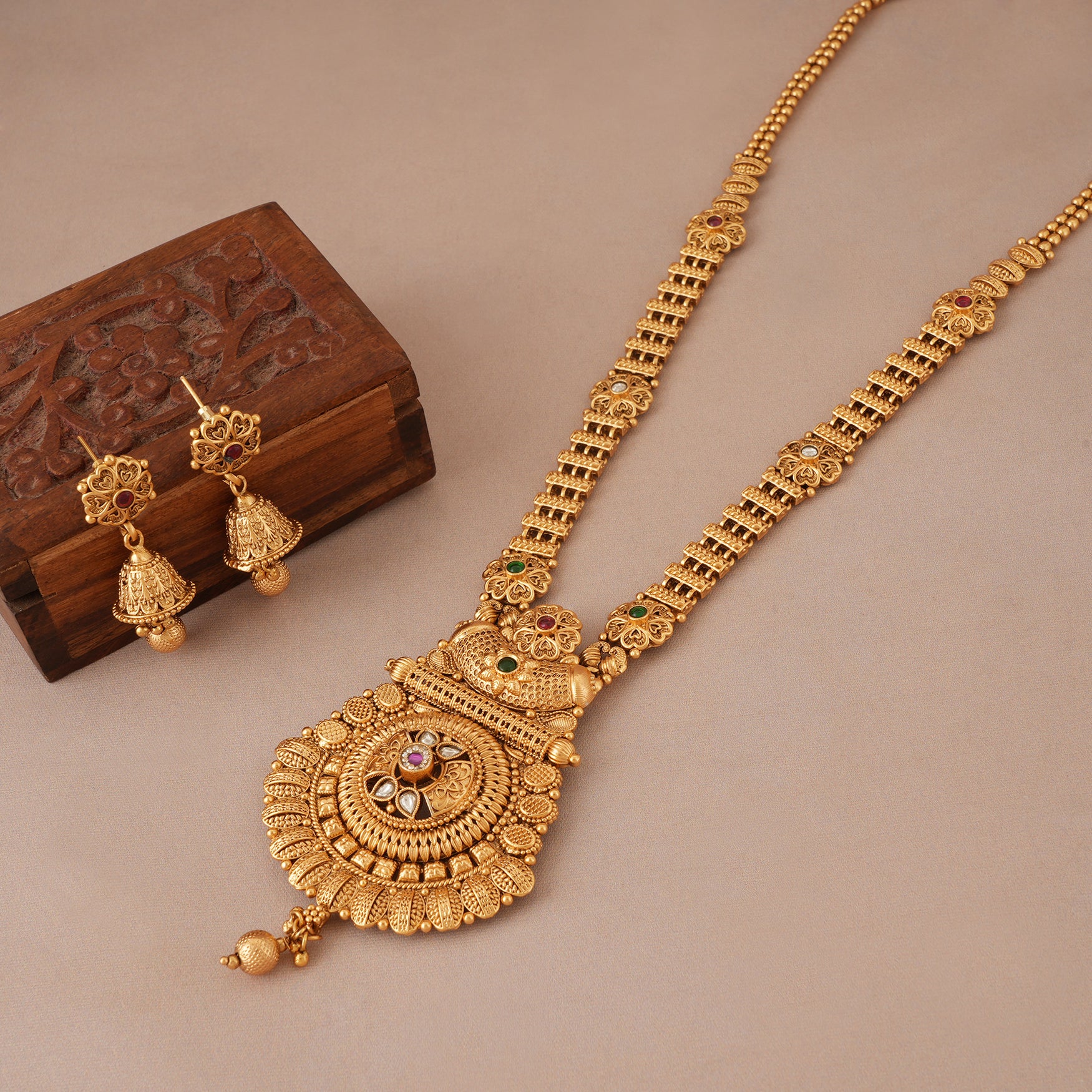 Buy Beautiful antique gold long stone traditional necklace set and get free shipping even on Cash on Delivery.