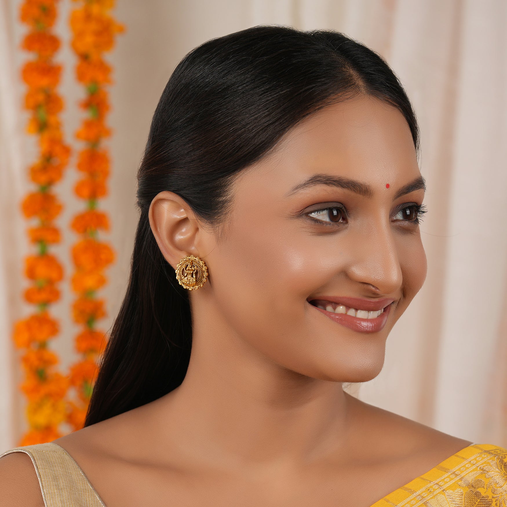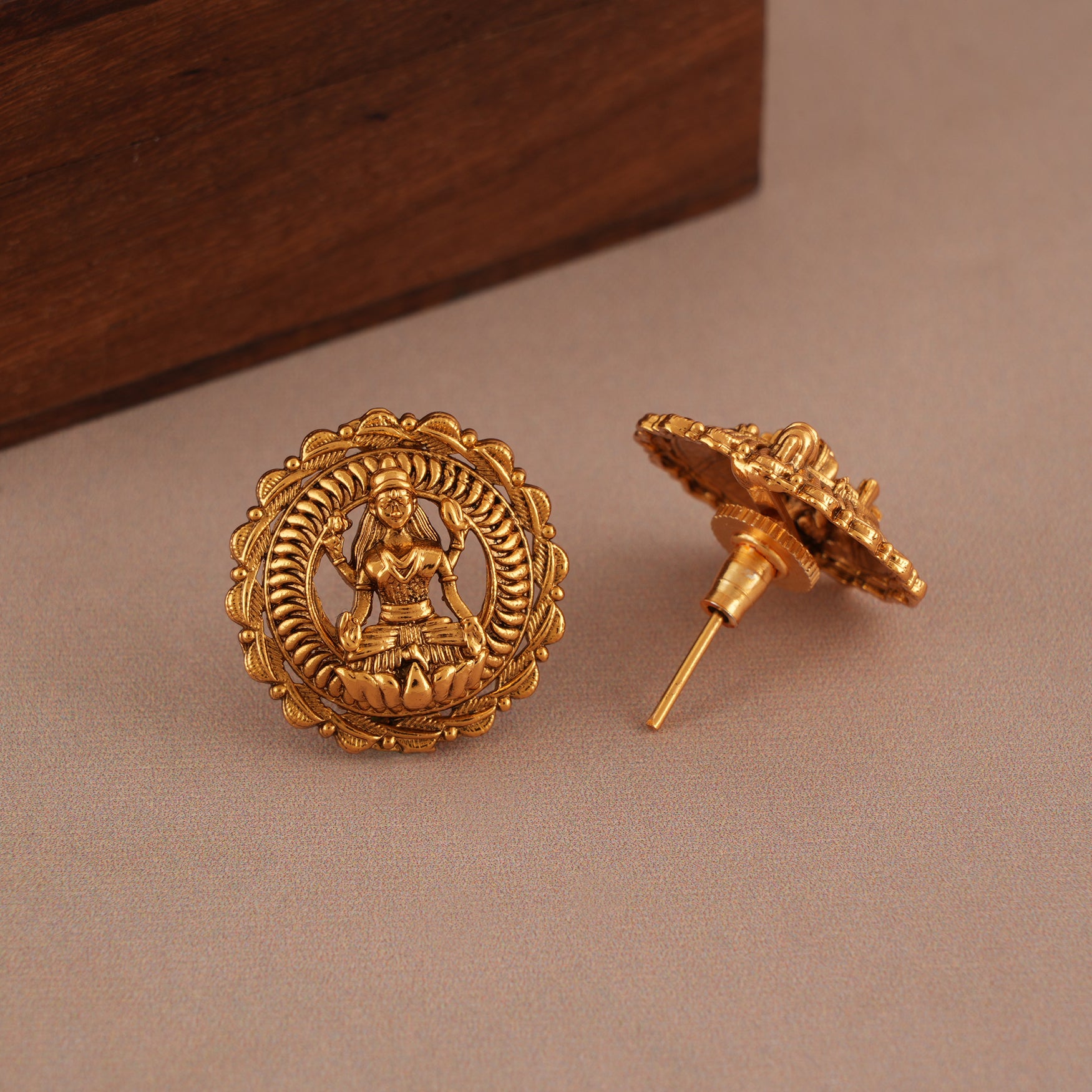Beautiful antique gold ma lakshmi stud earring I Temple Jewellery for women are show-stopping and come in traditional Indian design with gold plating and handwork.