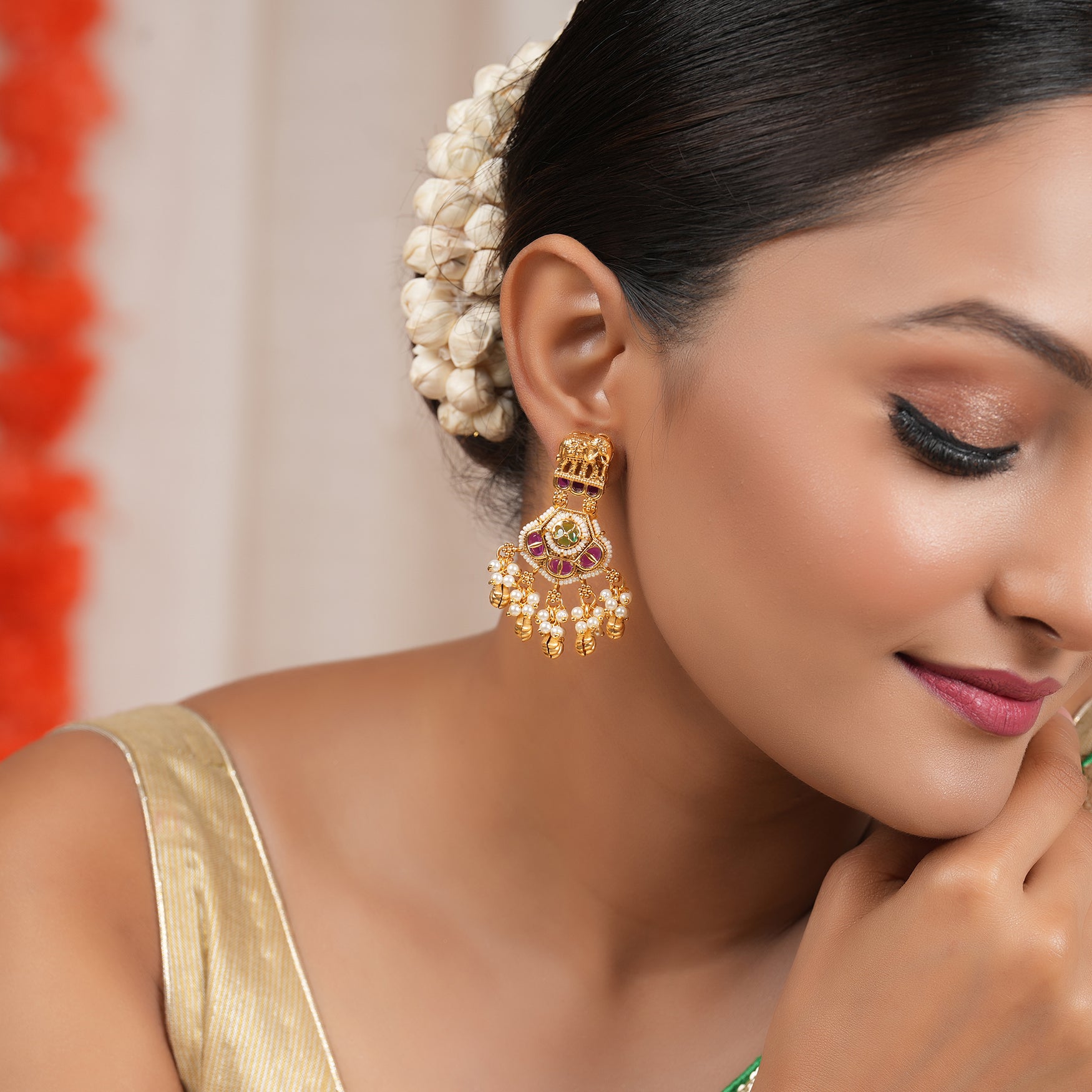 NOTE: These Beautiful antique gold multicolor stone rajwadi dangler earring       been crafted by hand and may have slight irregularities or imperfections in colour or embellishment. These irregularities are the result of human involvement in the process and add to the finished product's charm while ensuring you have a one-of-a-kind piece.