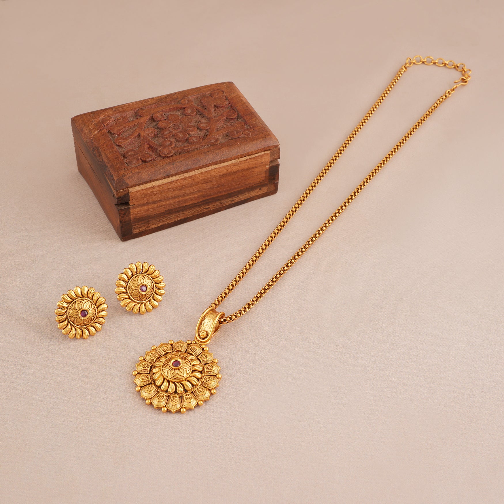 NOTE: This Beautiful antique gold pendant set for women with chain has been crafted by hand and may have slight irregularities or imperfections in color or embellishment. These irregularities are the result of human involvement in the process and add to the finished product's charm while ensuring you have a one-of-a-kind piece.