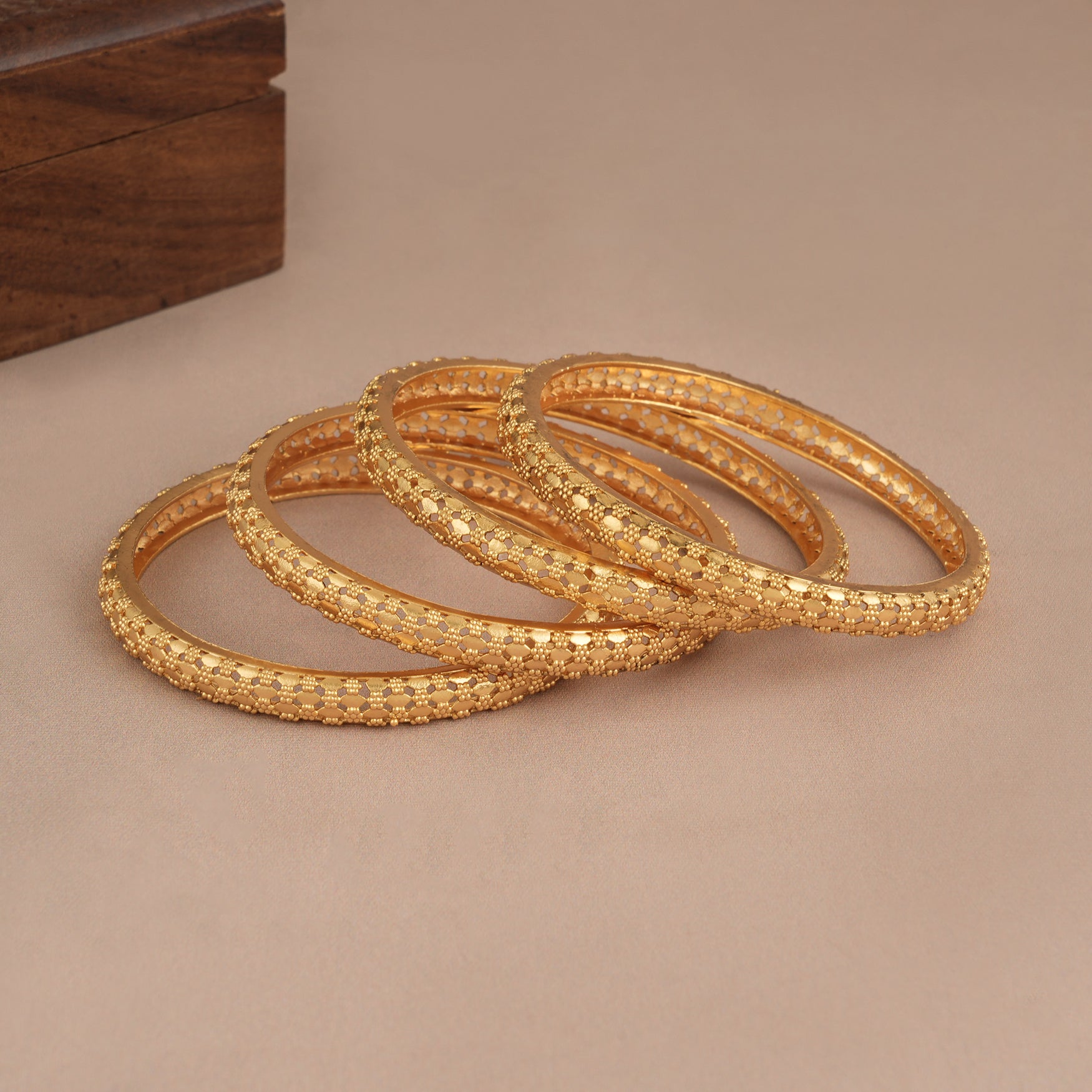 Beautiful antique gold plated bangle set for women ( set of 4 ) is a timeless piece that will provide you with years of beautiful wear. The metal-brass alloy with gold plating is made to last.