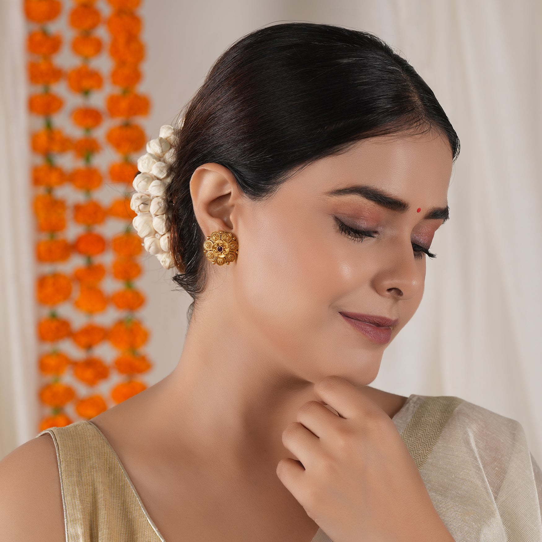 NOTE: These  Beautiful antique gold ruby stone traditional stud earring been crafted by hand and may have slight irregularities or imperfections in colour or embellishment. These irregularities are the result of human involvement in the process and add to the finished product's charm while ensuring you have a one-of-a-kind piece.