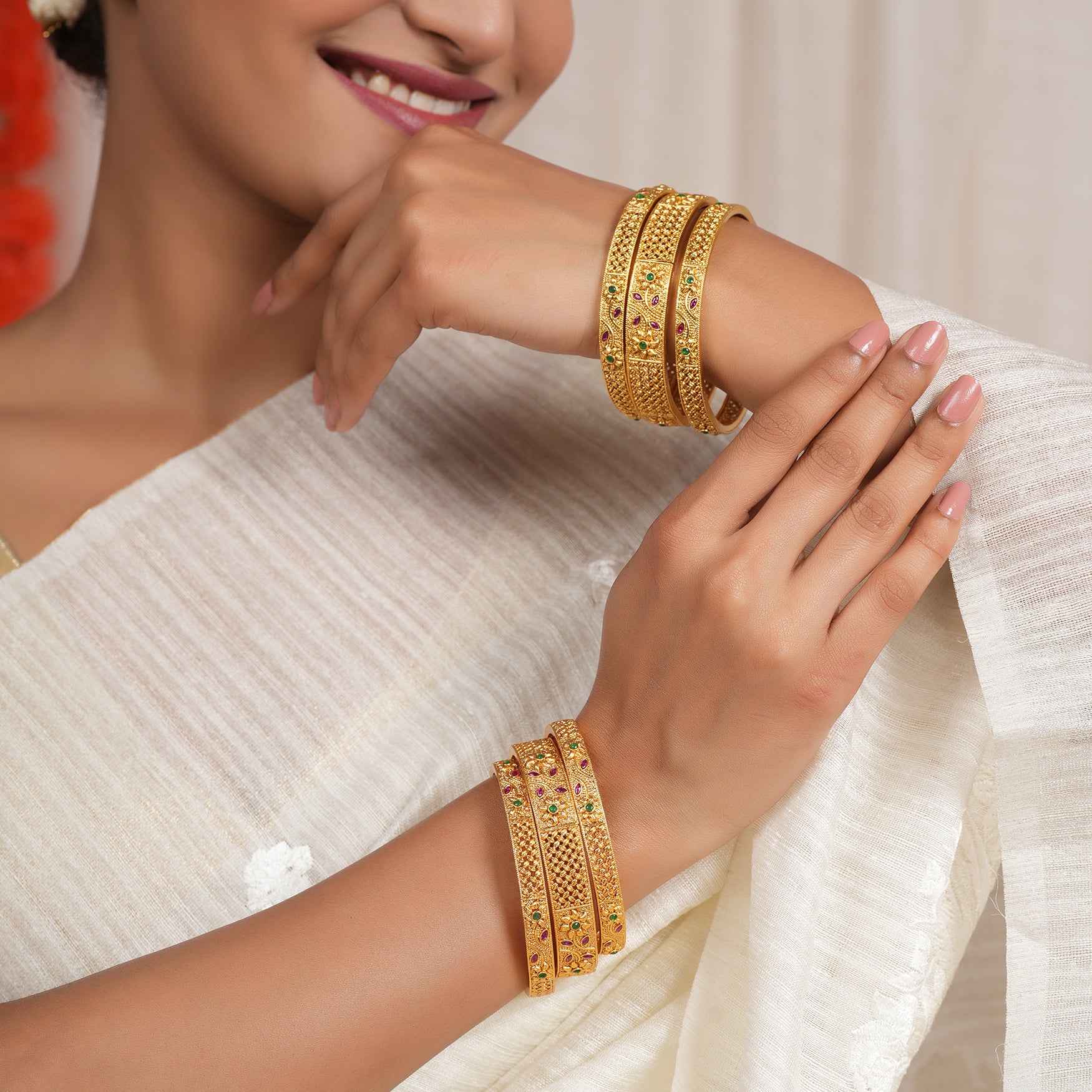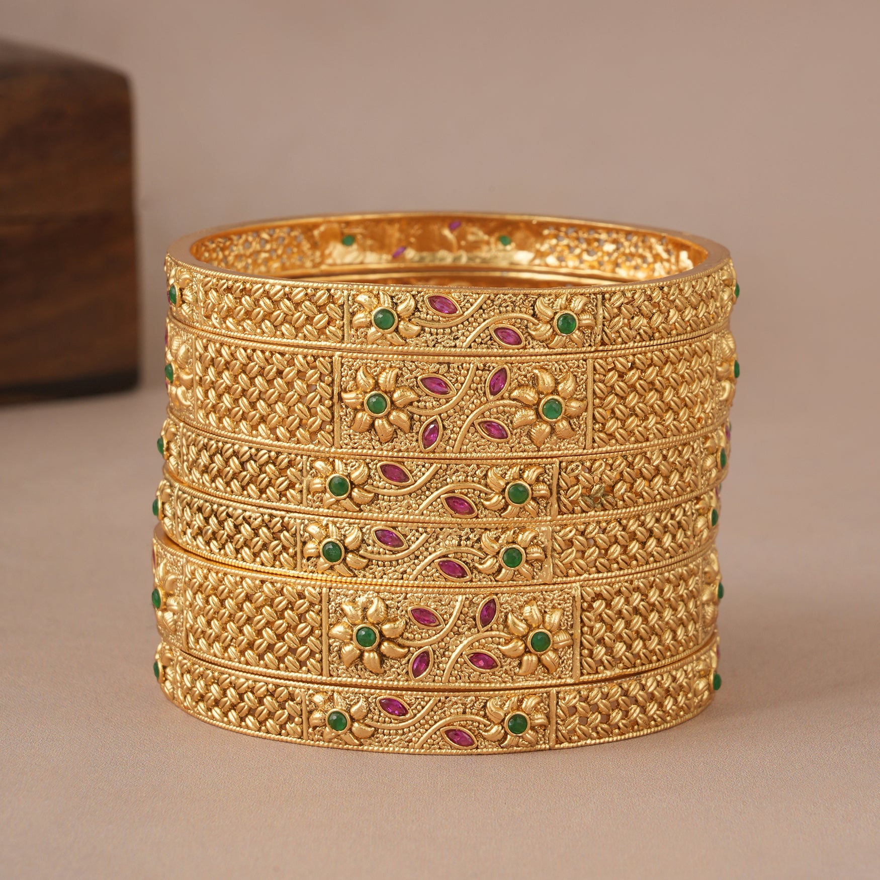 Beautiful antique gold stone bangle set (set of 6) is show-stopping and comes in traditional Indian design with gold plating and handwork. Buy Beautiful antique gold stone bangle set (set of 6)online and get free shipping even on Cash on Delivery