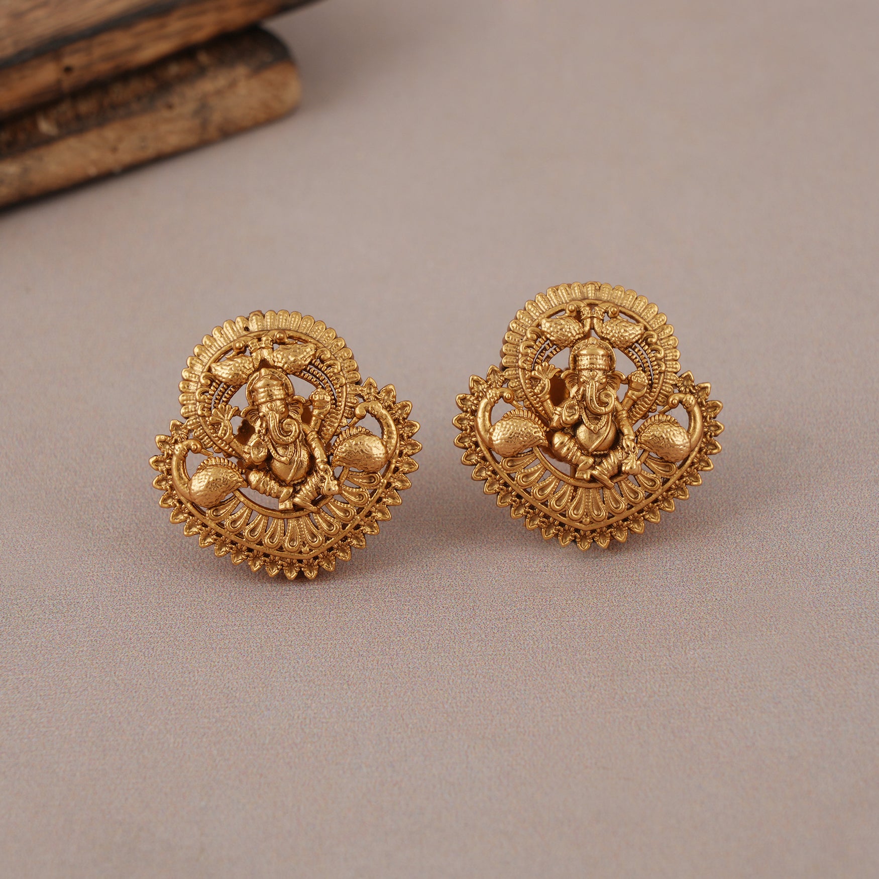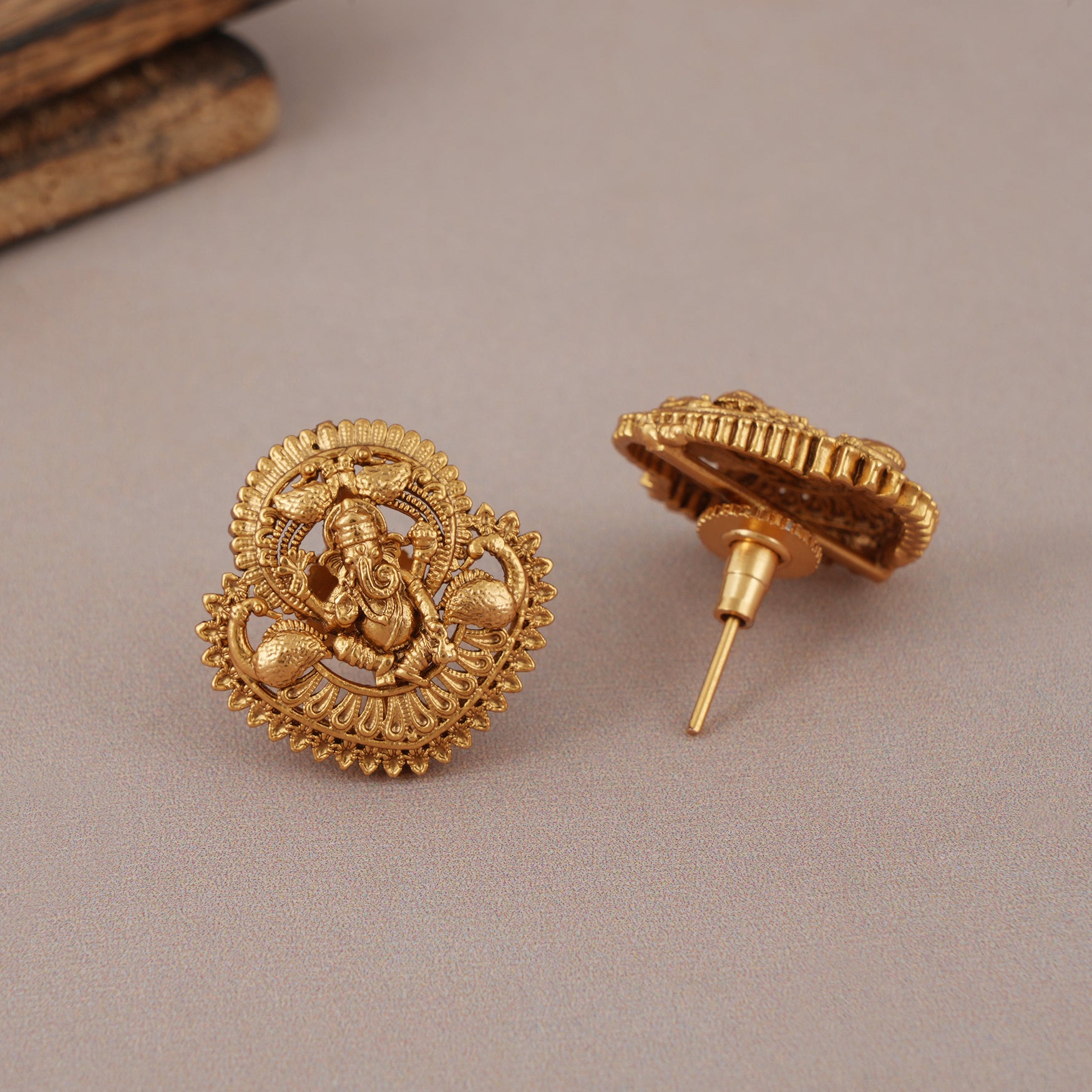 NOTE: This Beautiful antique gold ganesh pendant set with earring I Temple jewellery  with earring has been crafted by hand and may have slight irregularities or imperfections in colour or embellishment. These irregularities are the result of human involvement in the process and add to the finished product's charm while ensuring you have a one-of-a-kind piece.