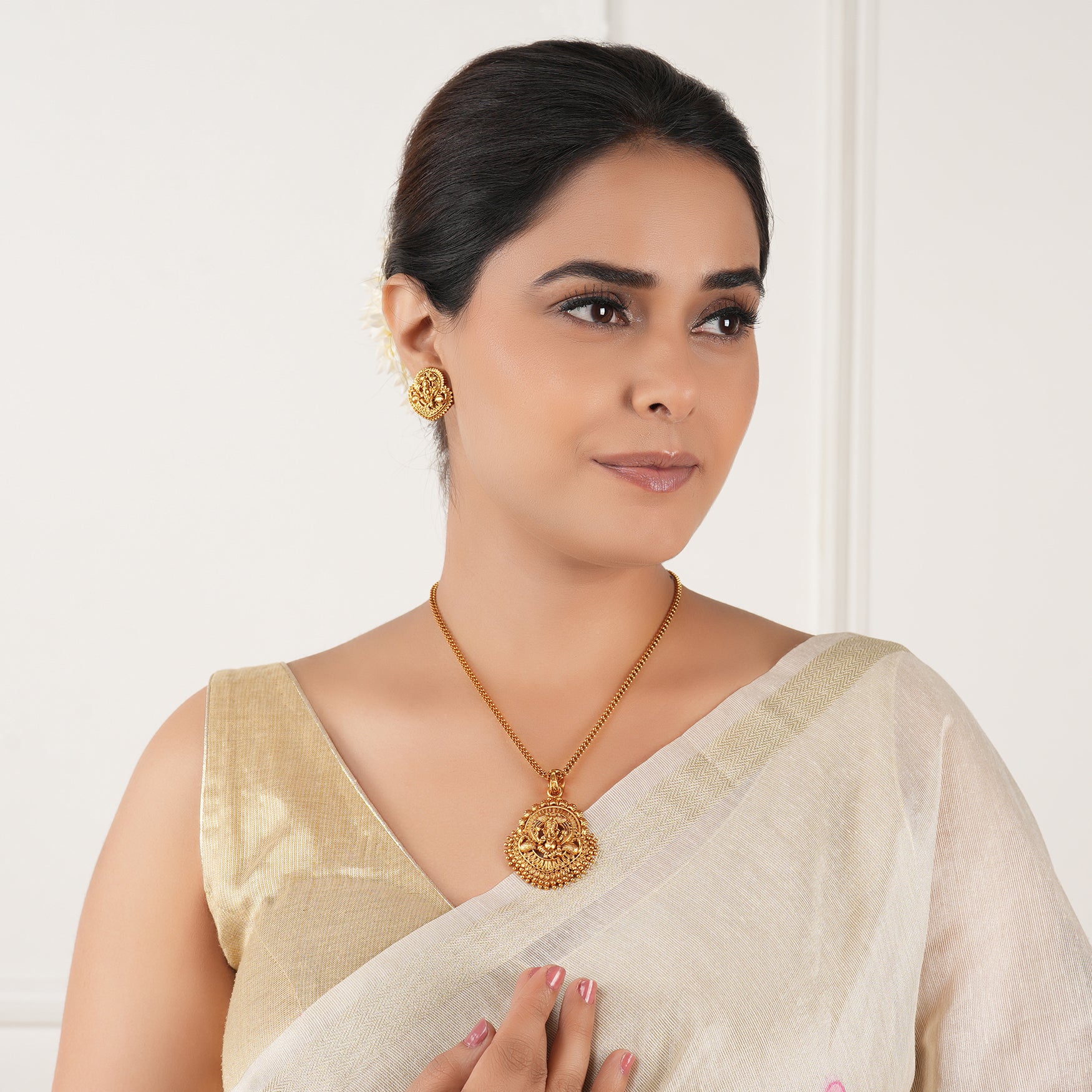 Beautiful antique gold ganesh pendant set with earring I Temple jewellery  is made of brass alloy with gold plating. This gold stone necklace set length is 22 inches, and its lock is hook lock The earrings are 0.7 inches long, and the earring lock is push back. You can adjust the length of the necklace to your desired length as it has a hook lock. This set comes with beautiful pair of matching earrings. Beautiful antique gold ganesh pendant set with earring I Temple jewellery  is a show-stopping, traditional Indian necklace set with gold plating and handwork. Buy Beautiful antique gold ganesh pendant set with earring I Temple jewellery  designs in gold and get free shipping even on Cash on Delivery.
