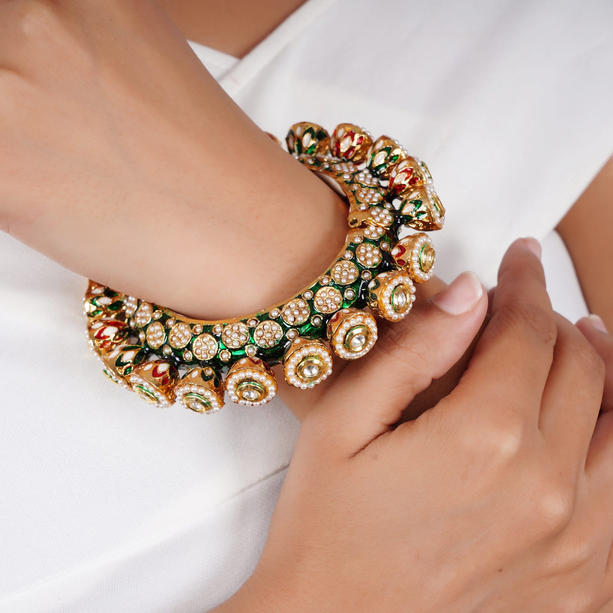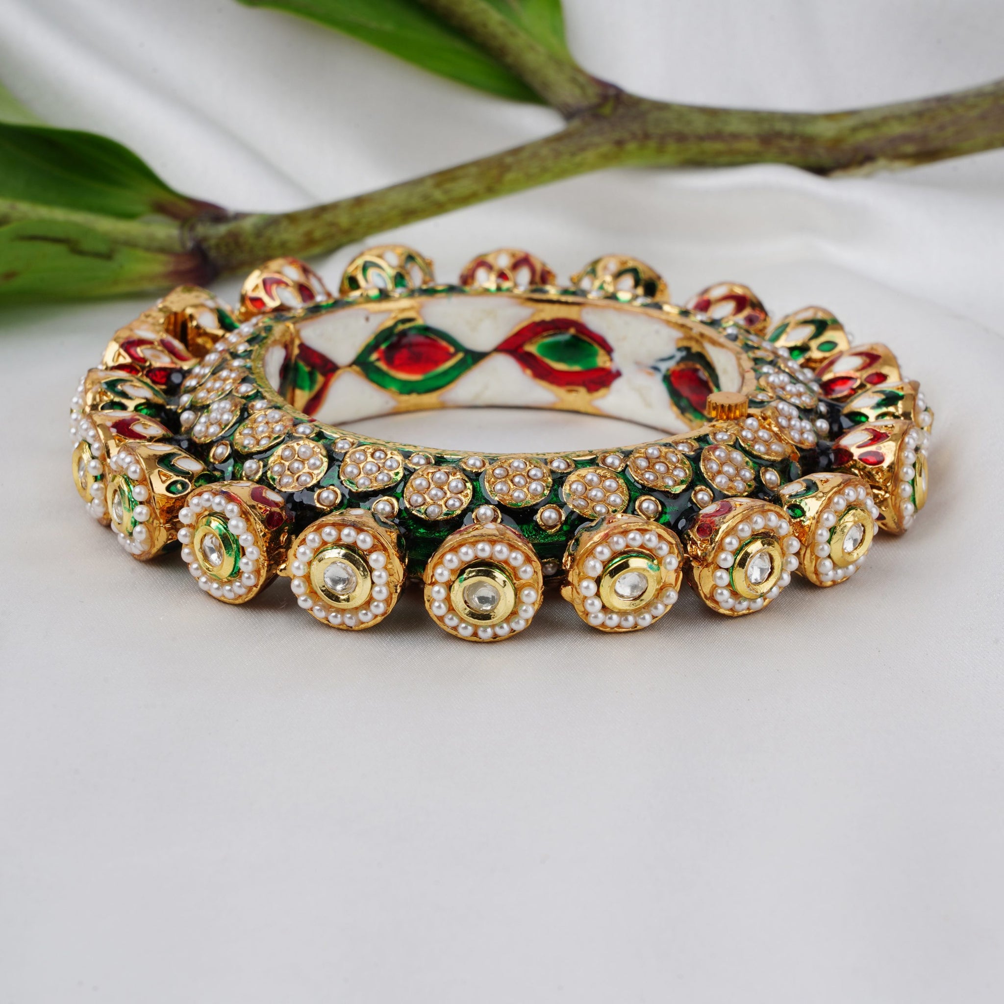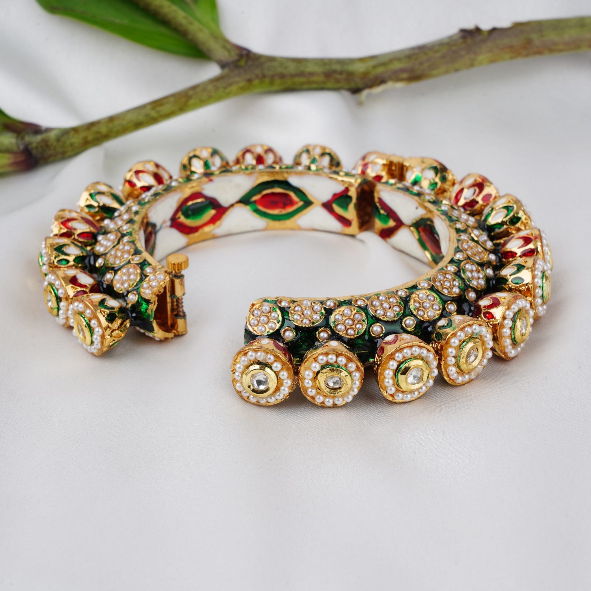 Beautiful Kundan Enamel Kada Bangle is a timeless piece that will provide you with years of beautiful wear. The metal-brass alloy with gold plating is made to last, while the synthetic pearl and enamel give the bangle a touch of unmatched elegance. To ensure your bangle stay securely on your wrist, this Kada bangle is designed with a screw lock. If you need to double-check your size before placing an order, please refer to our size chart for this model. This Kundan enamel Kada bangle is show-stopping and comes in traditional Indian design with gold plating and handwork.   Buy Kundan Enamel Kada bangle and get free shipping even on Cash on Delivery