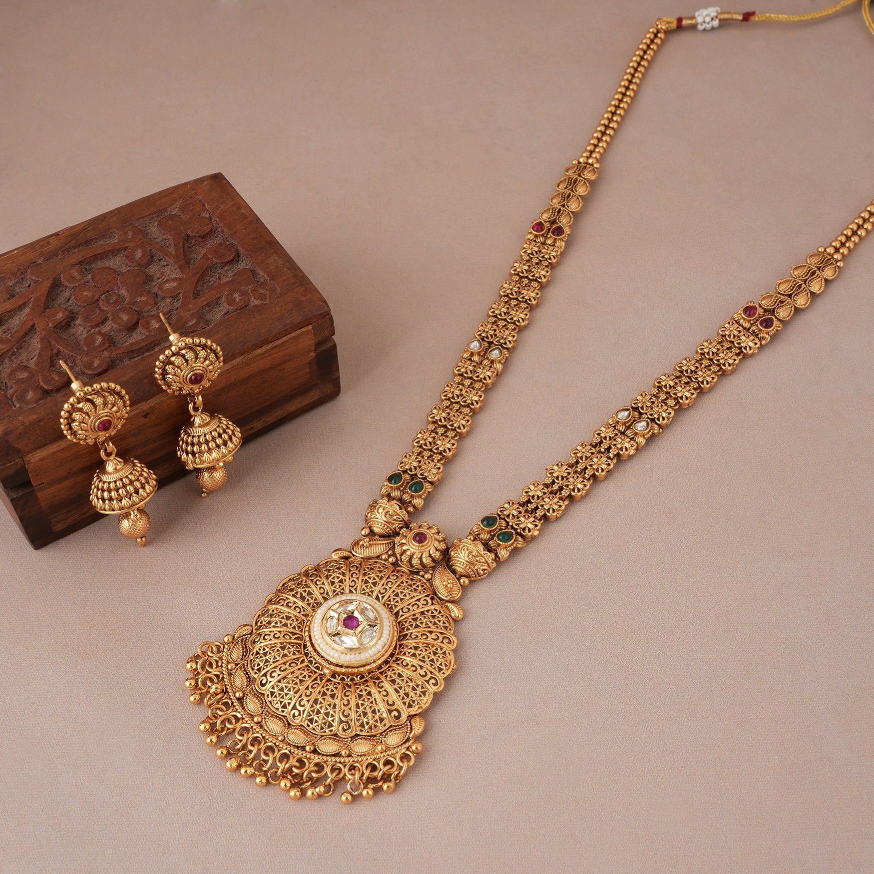Beautiful long traditional stone necklace set for women are show-stopping and come in traditional Indian design with gold plating and handwork.