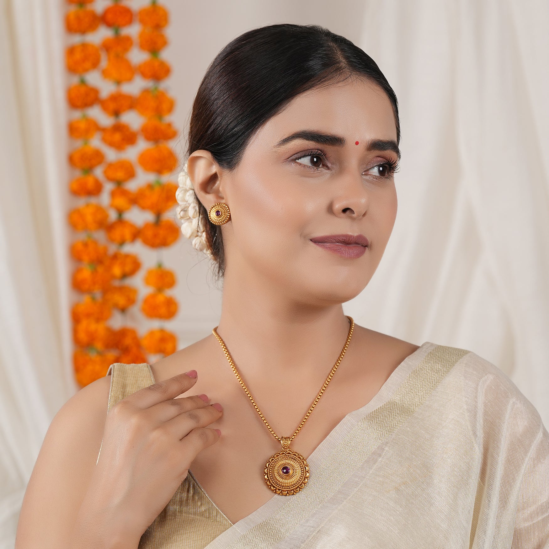 NOTE: This Beautiful traditional antique gold round pendant set has been crafted by hand and may have slight irregularities or imperfections in color or embellishment. These irregularities are the result of human involvement in the process and add to the finished product's charm while ensuring you have a one-of-a-kind piece.