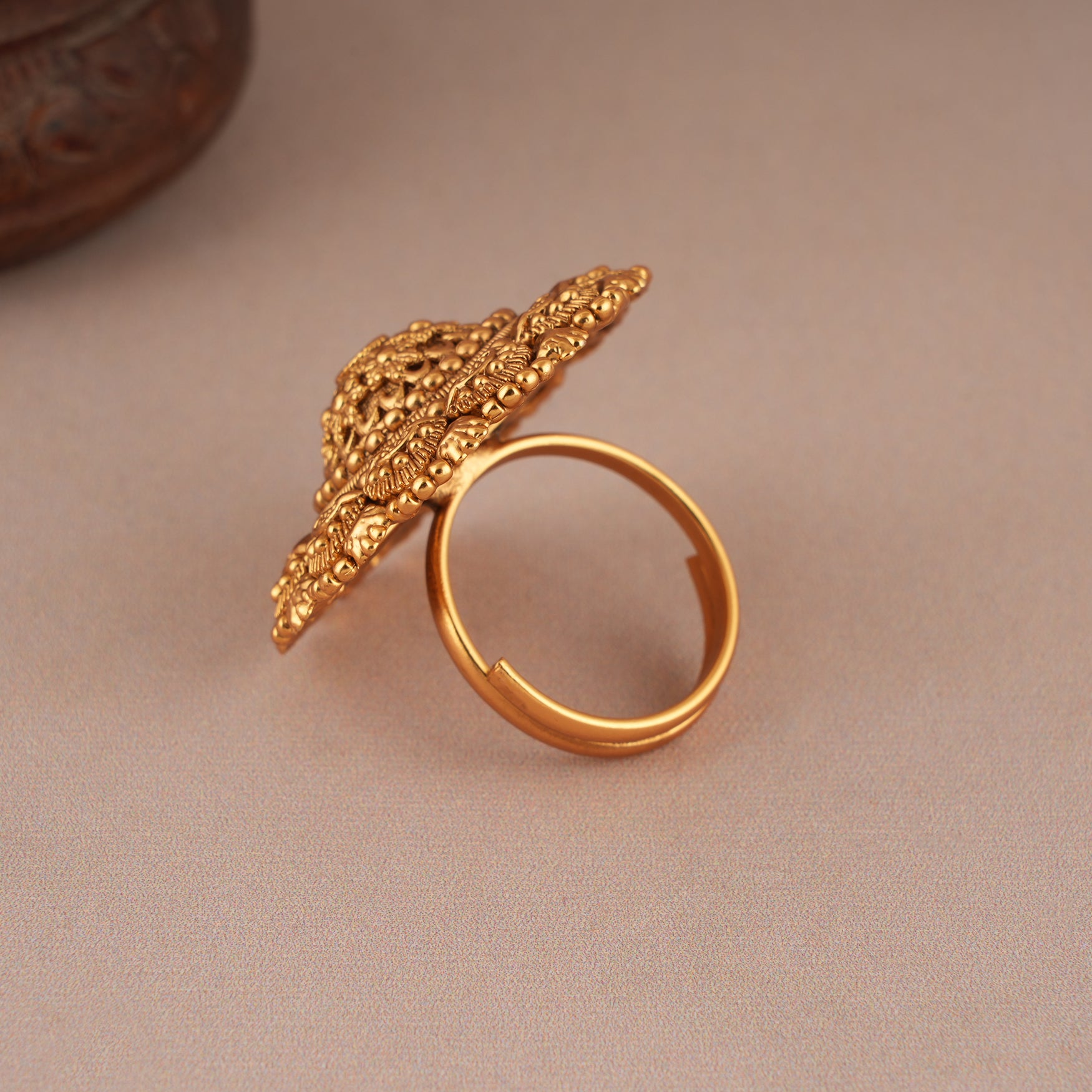 Bold antique gold carving finger ring for women is show-stopping and comes in traditional Indian design with gold plating and handwork.