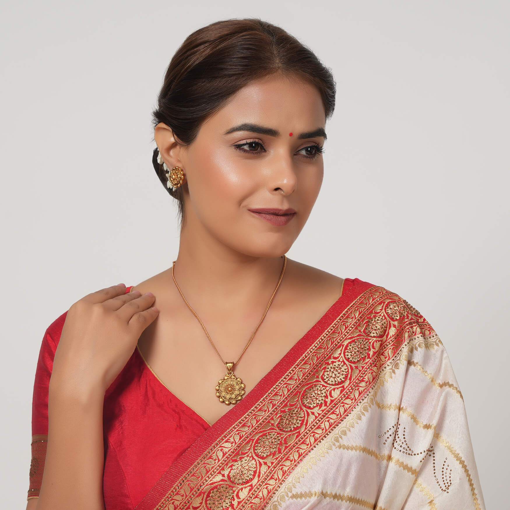 Cute antique gold finish floral pendant set with stud earring   is made of brass alloy with gold plating. The necklace length is 22 inches, and the necklace lock is a drawing string. The earrings are 0.8inch long, and its lock is a push-back. This set comes with beautiful pair of matching earrings Cute antique gold finish floral pendant set with stud earring   is a show-stopping, traditional Indian necklace set with gold plating and handwork. Buy this Cute antique gold finish floral pendant set with stud earring  is and get free shipping even on Cash on Delivery