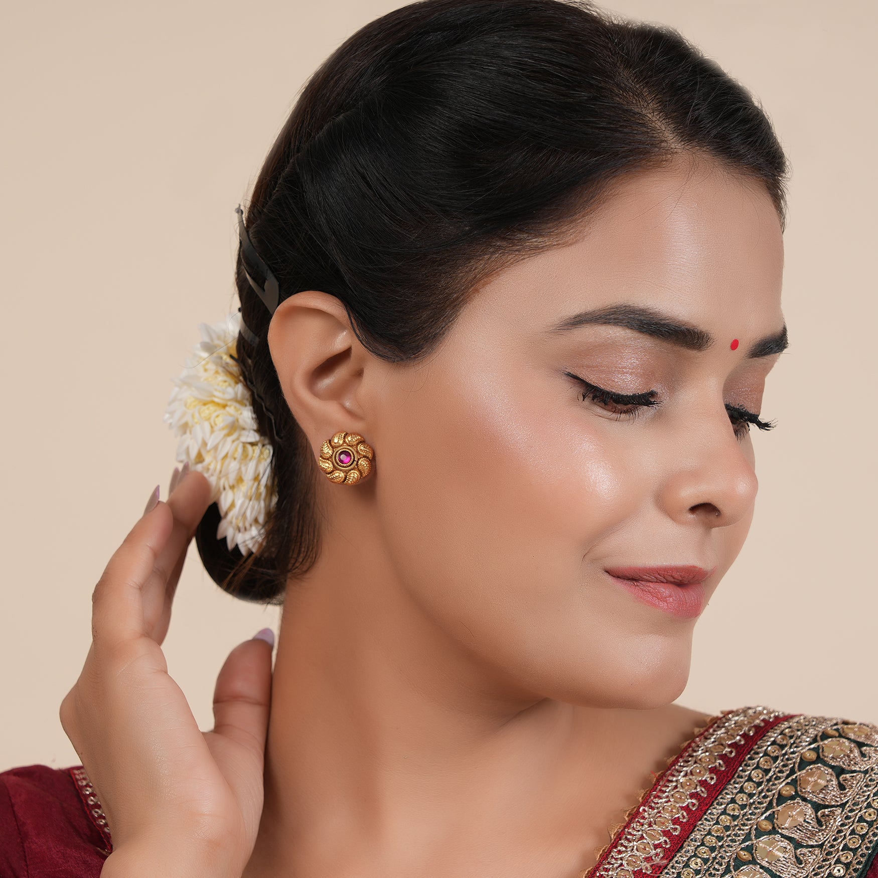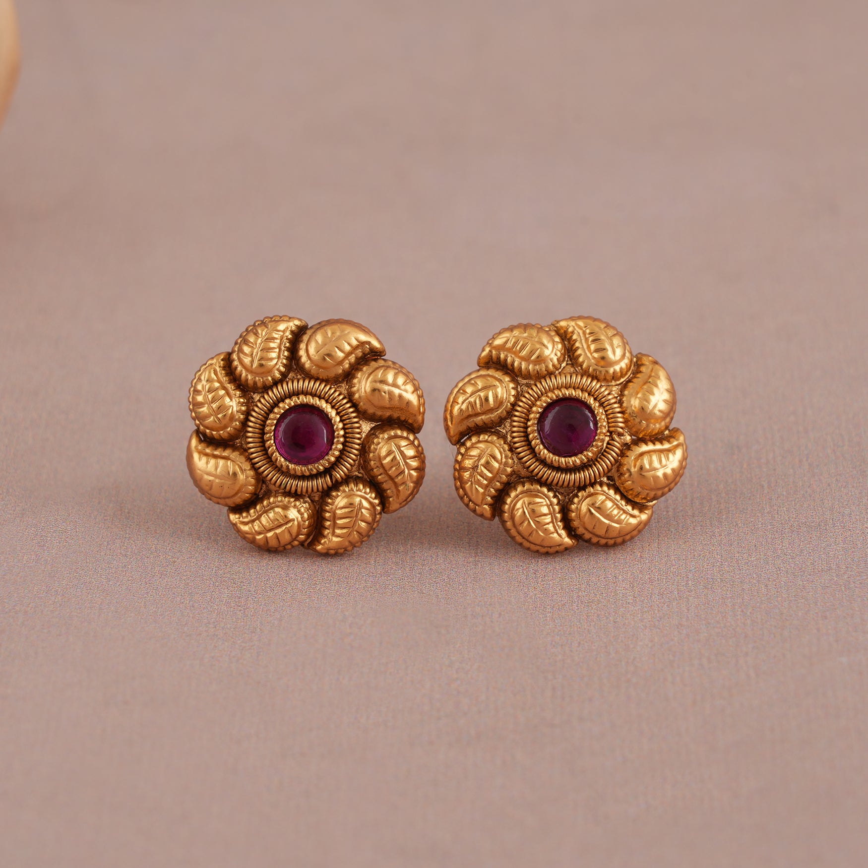 NOTE: These Cute antique gold floral ruby stone stud earring have been crafted by hand and may have slight irregularities or imperfections in colour or embellishment. These irregularities are the result of human involvement in the process and add to the finished product's charm while ensuring you have a one-of-a-kind piece.