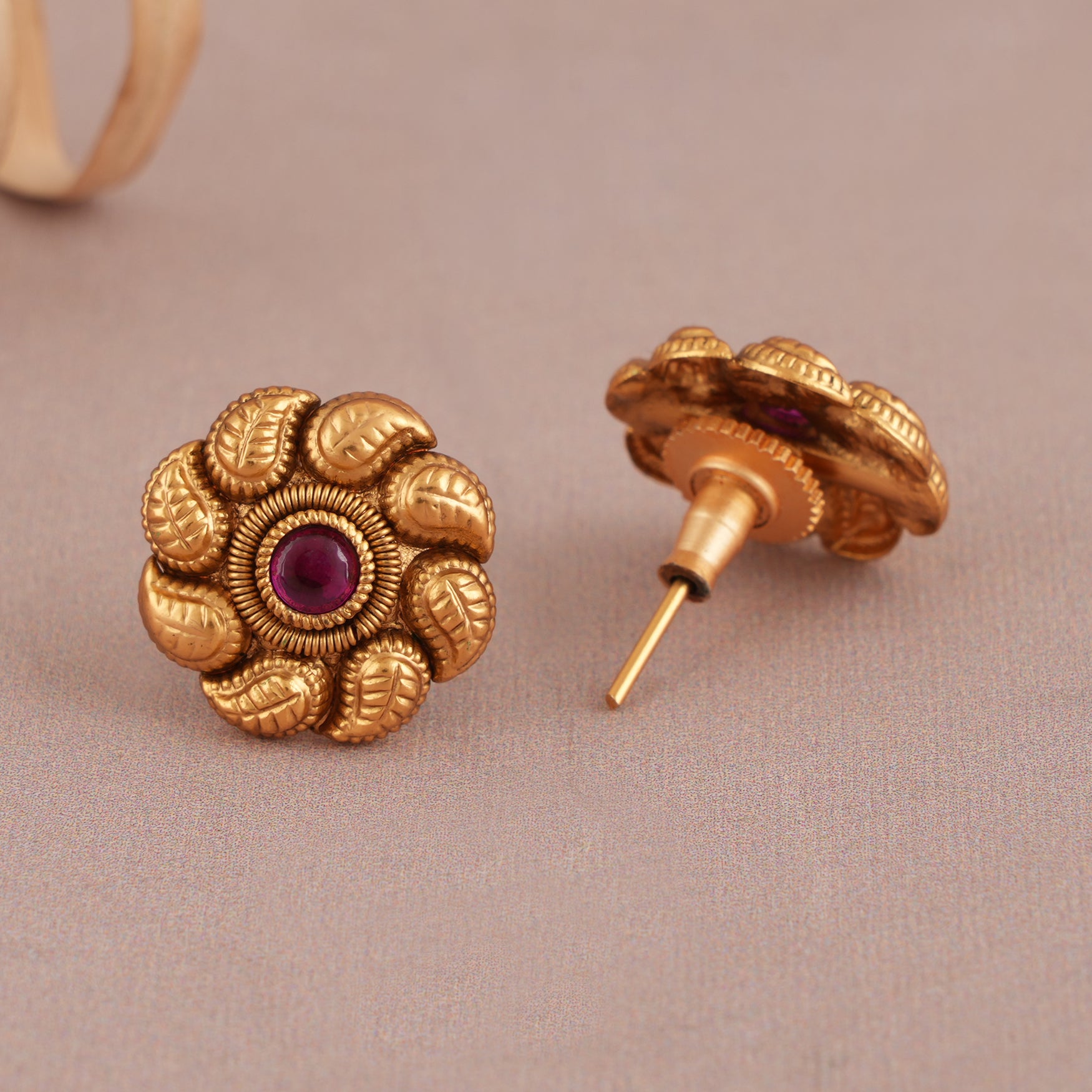 Cute antique gold floral ruby stone stud earring are show-stopping and come in traditional Indian design with gold plating and handwork.