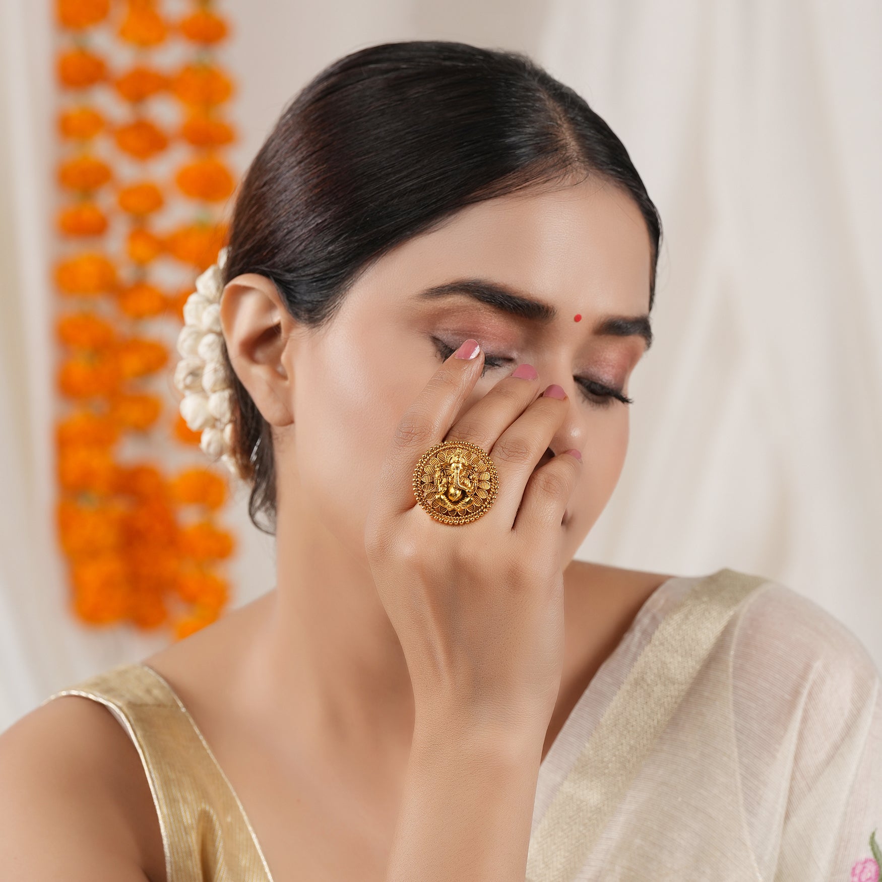 Cute antique gold lord ganesh finger ring I Temple Jewellery is a timeless piece that will provide you with years of beautiful wear. The metal-brass alloy with gold plating is made to last.