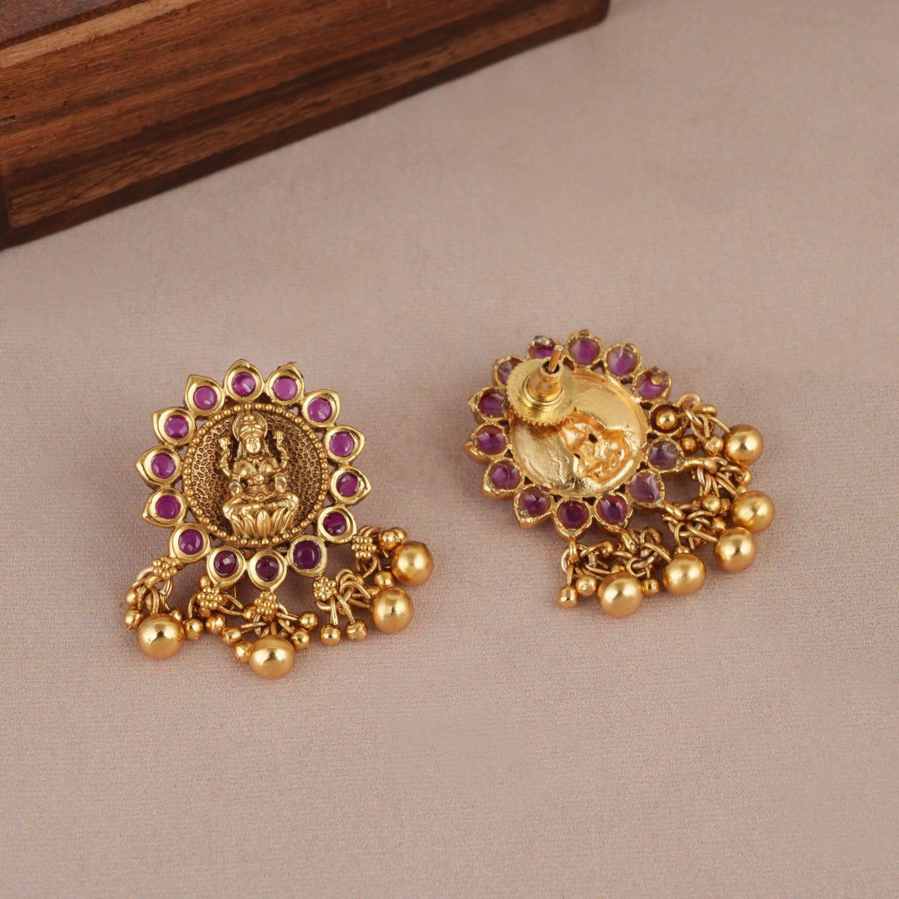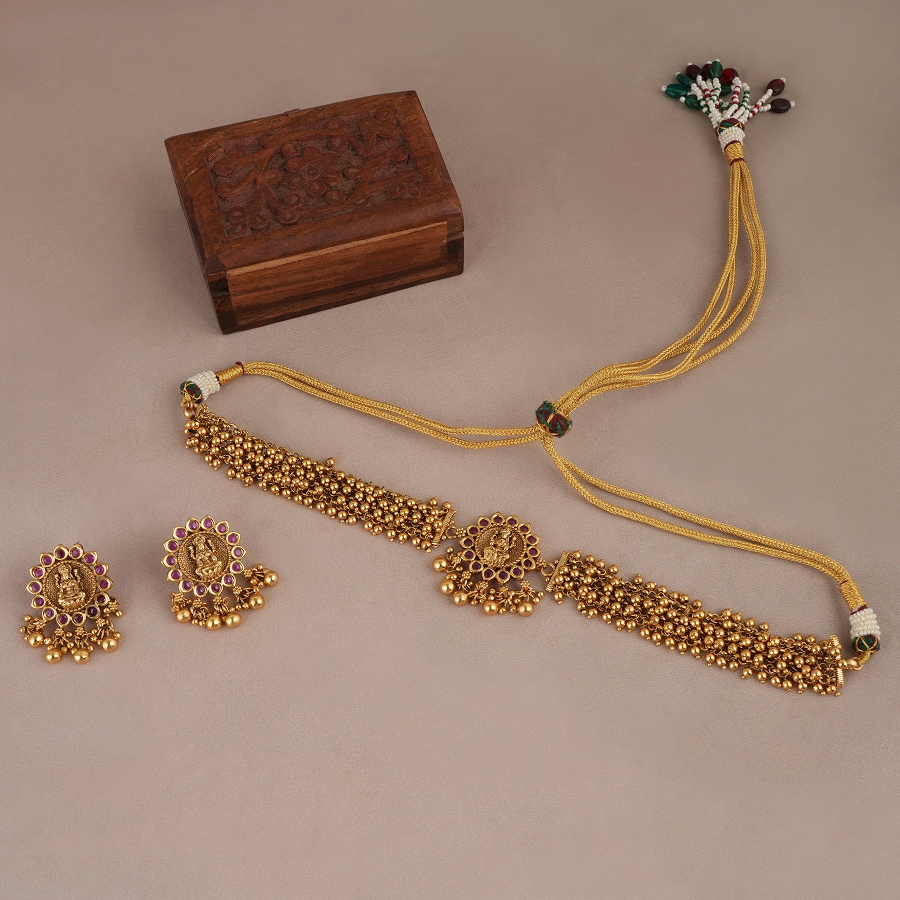 Cute antique gold maa lakshmi ruby choker set | Temple jewellery. This gold necklace set length is 16 inches, and its lock is drawing string. The earrings are 1.2 inch long, and the earring lock is push back. You can adjust the length of the necklace to your desired length as it has a drawing string. This set comes with beautiful pair of matching earrings. The pearls drop necklace is a show-stopping, traditional Indian necklace set with gold plating and handwork. Buy this buy Cute antique gold maa lakshmi ruby choker set online and get free shipping even on Cash on Delivery.