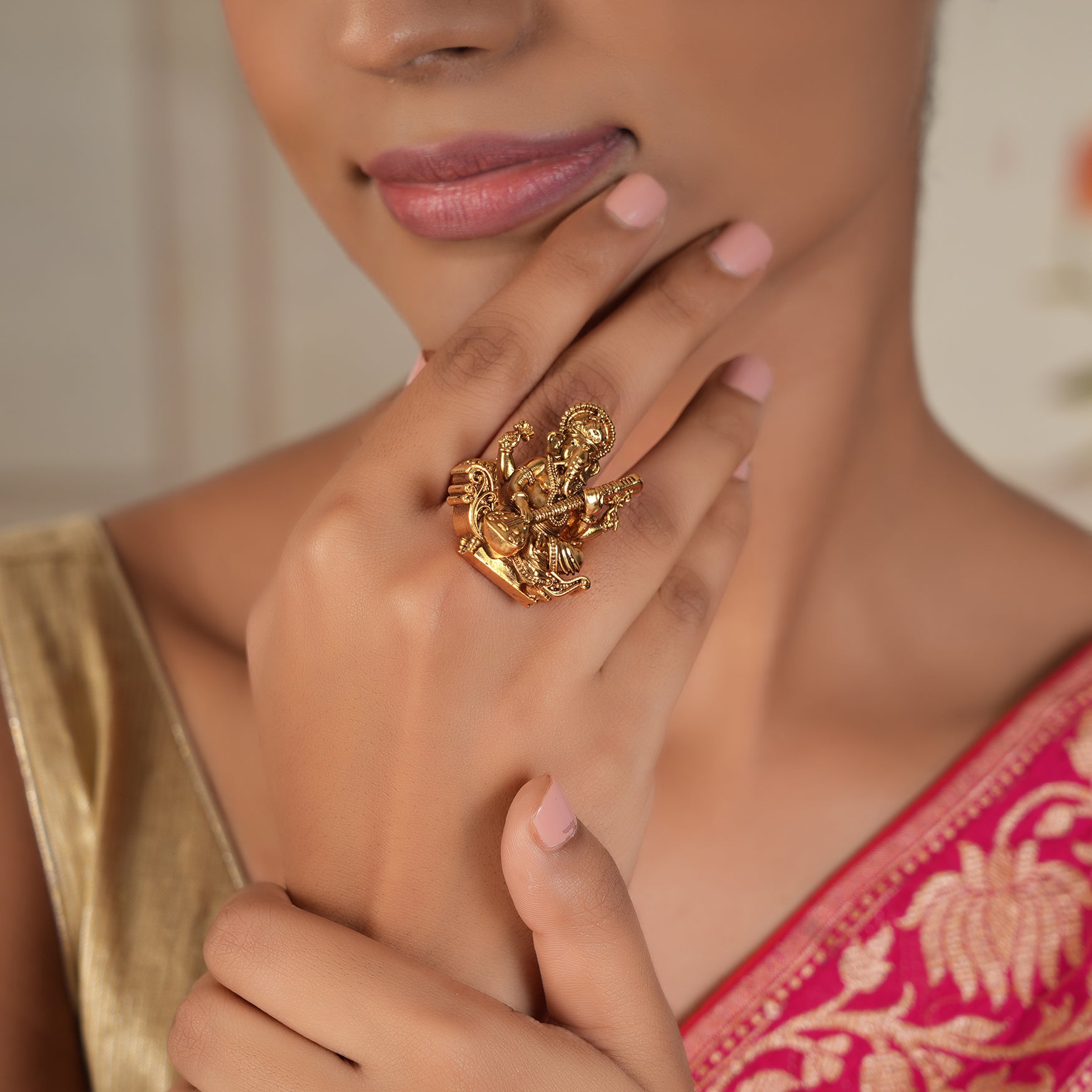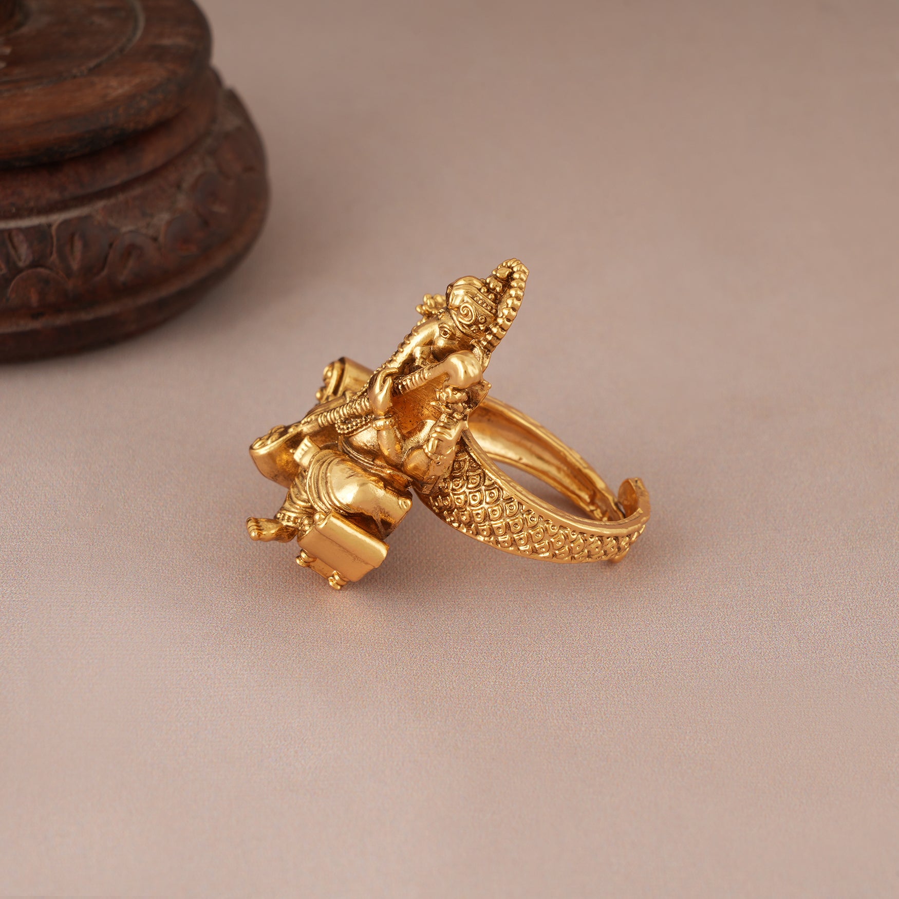 Stunning antique gold Ganesh Maharaj finger ring for women  is show-stopping and comes in traditional Indian design with gold plating and handwork.