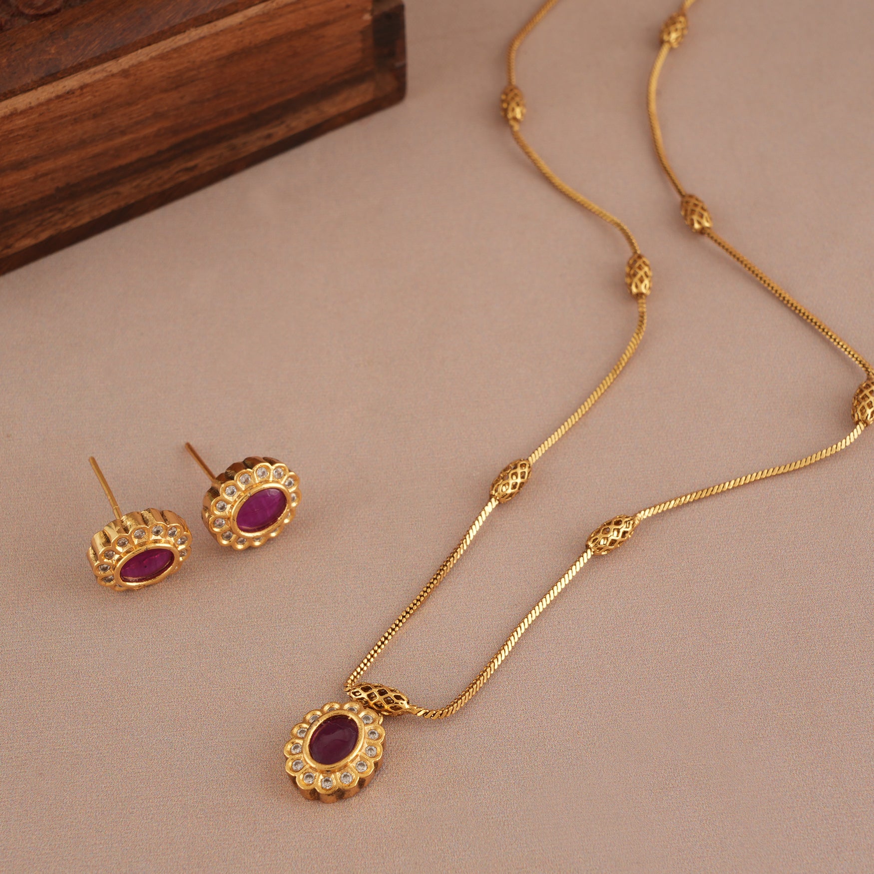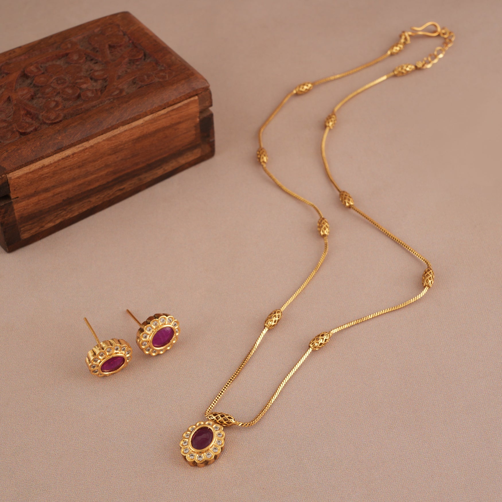 NOTE: This Cute antique gold ruby stone pendant set has been crafted by hand and may have slight irregularities or imperfections in color or embellishment. These irregularities are the result of human involvement in the process and add to the finished product's charm while ensuring you have a one-of-a-kind piece.
