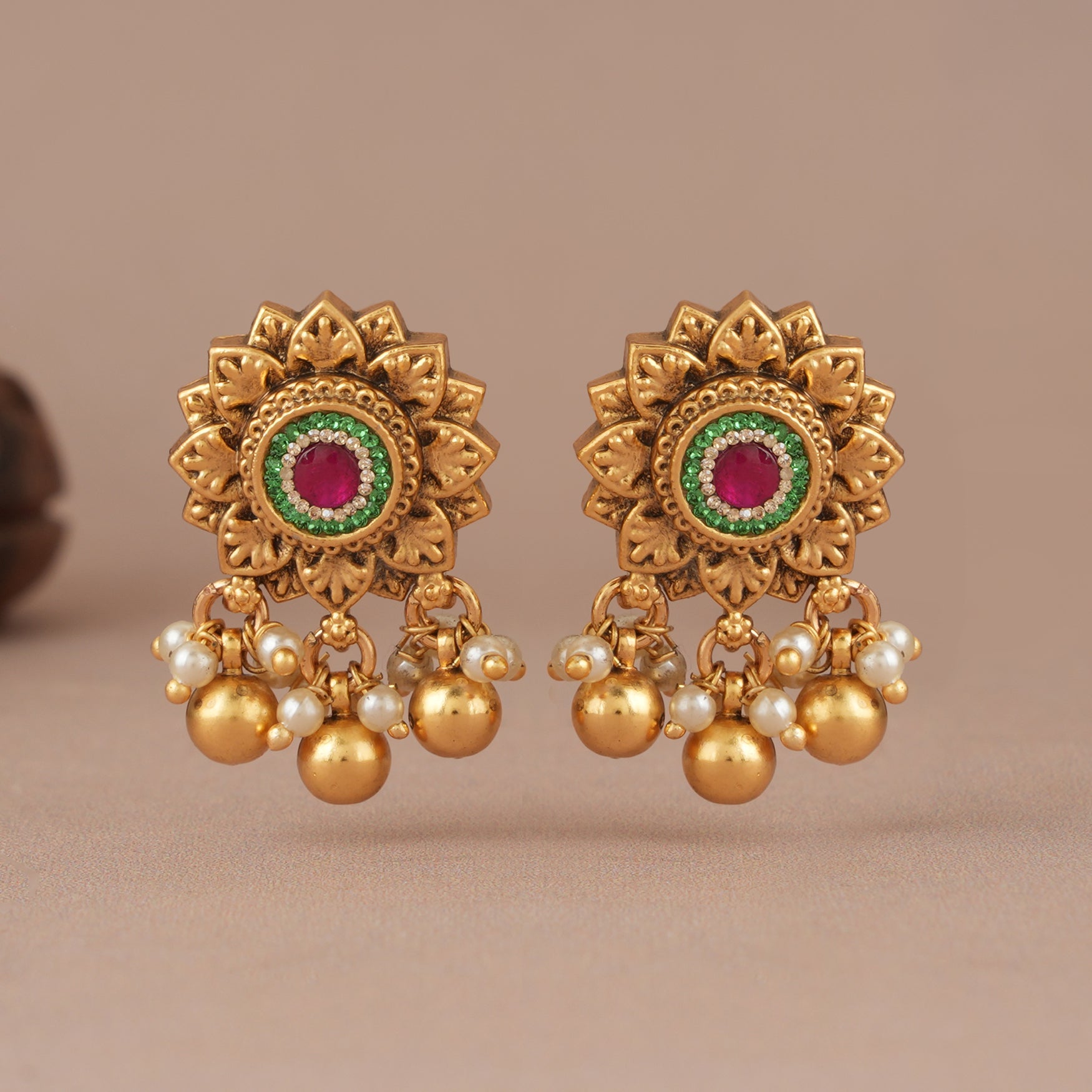 Cute antique gold stone floral earring    of brass alloy with gold plating. These earrings are 1 inches long, and the lock is push back.  Cute antique gold stone floral earring    how-stopping and come in traditional  Indian   design with gold plating and handwork.