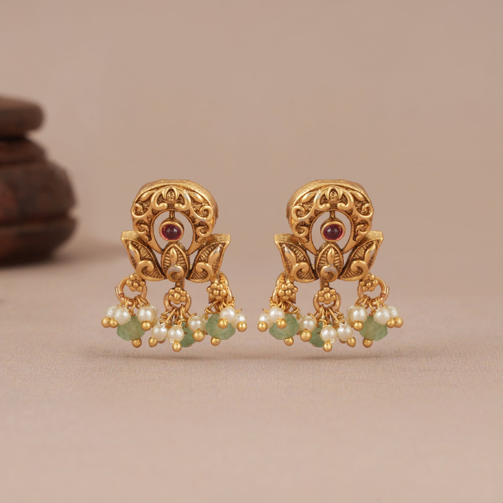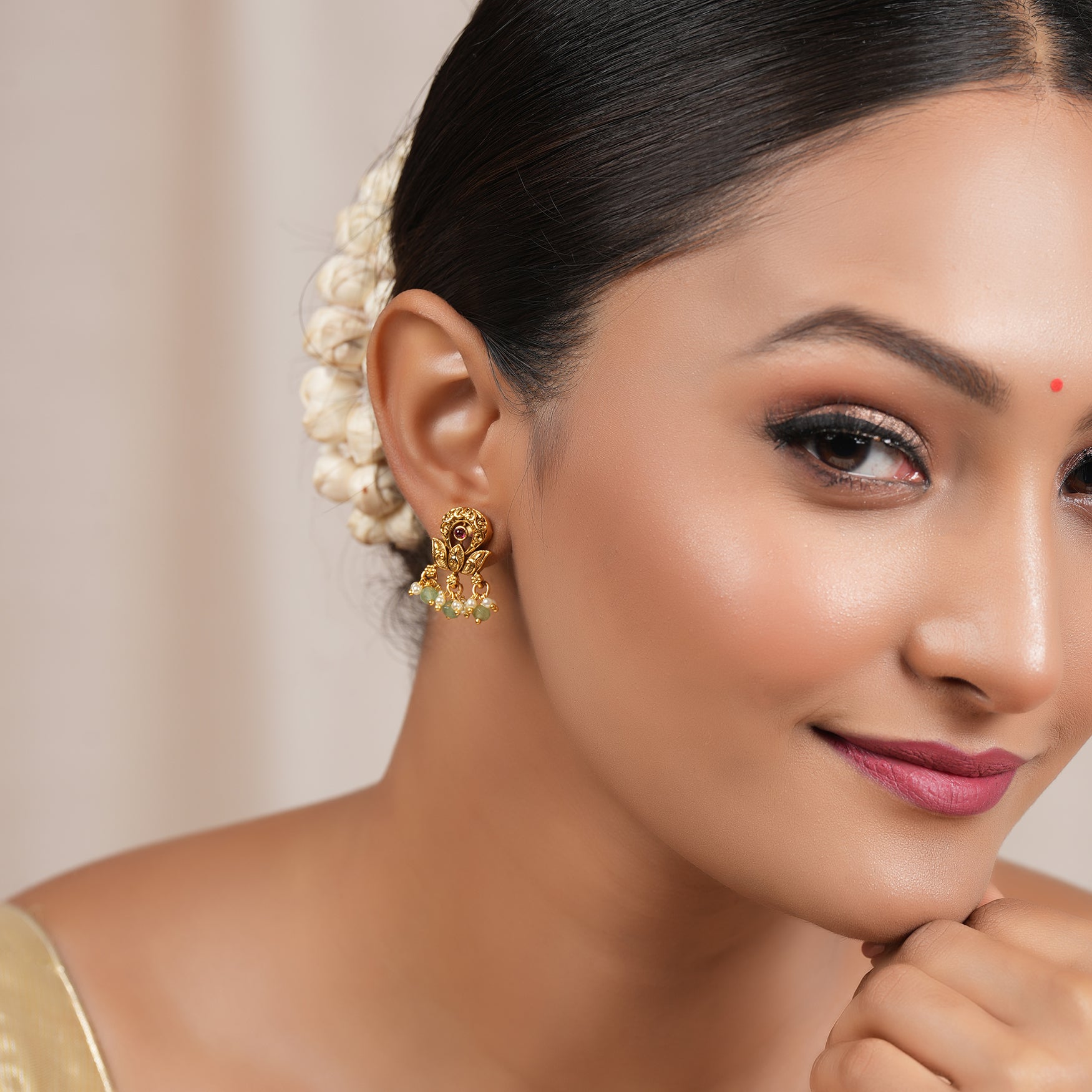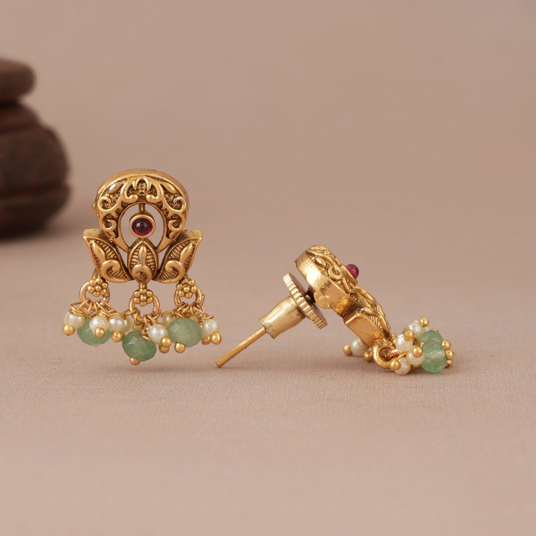 Cute antique stone drop small earring  of brass alloy with gold plating. These earrings are  0.8  inches long, and the lock is push back. Cute antique stone drop small earring show-stopping and come in traditional  Indian   design with gold plating and handwork.