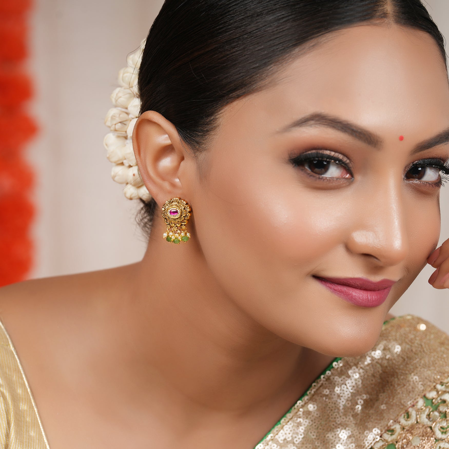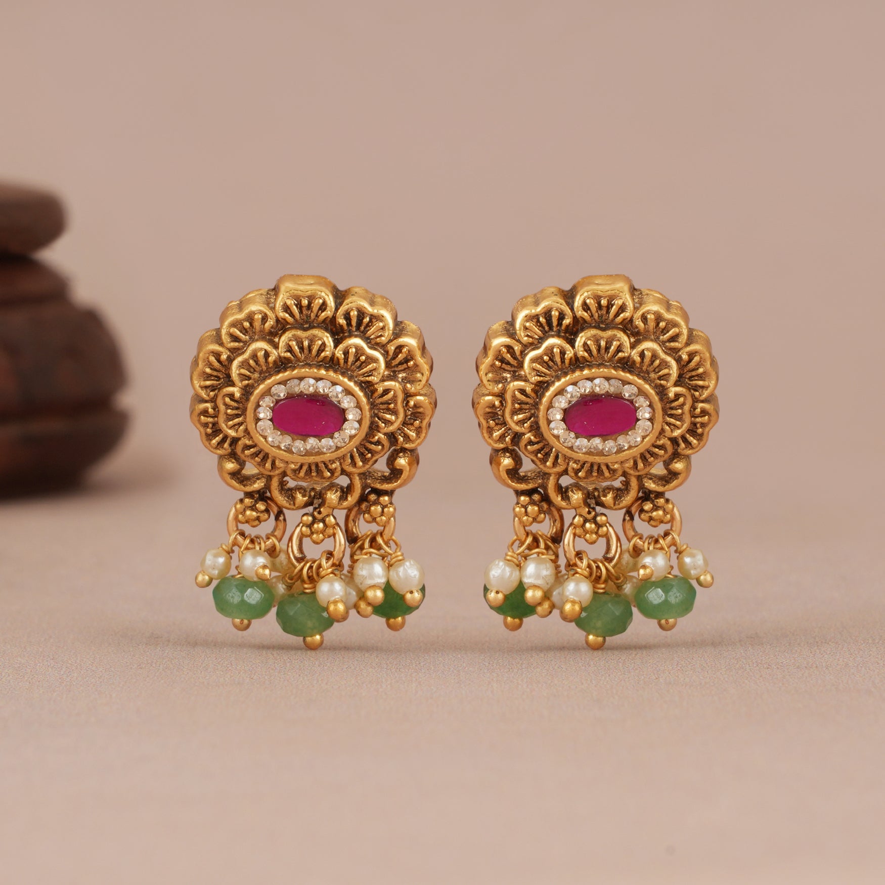 Cute delicate antique gold stone green stone drop earring    of brass alloy with gold plating. These earrings are  0.9 inches long, and the lock is push back.Cute delicate antique gold stone green stone drop earring  show-stopping and come in traditional  Indian   design with gold plating and handwork.