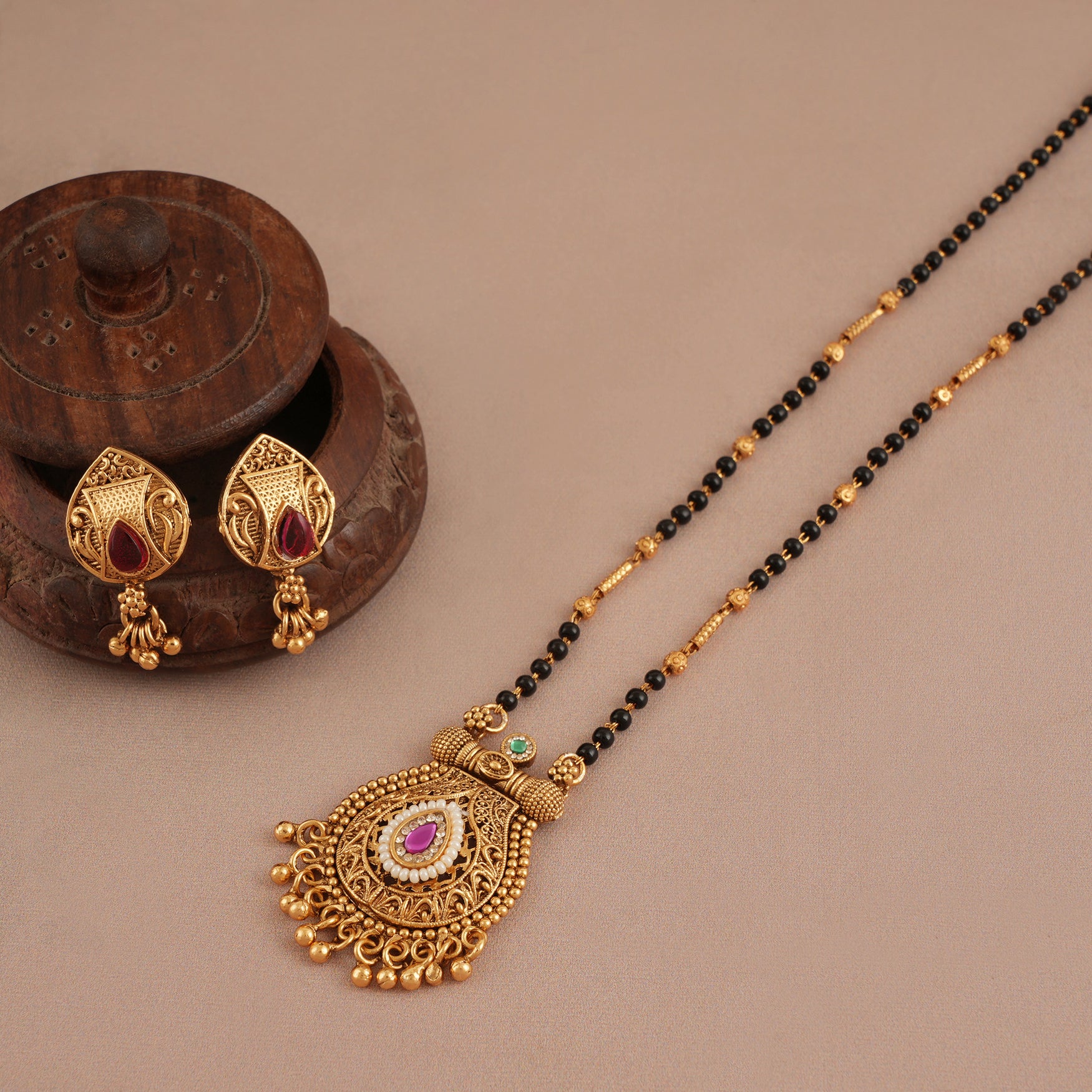 NOTE: Cute elegant antique gold mangalsutra set is has been crafted by hand and may have slight irregularities or imperfections in color or embellishment. These irregularities are the result of human involvement in the process and add to the finished product's charm while ensuring you have a one-of-a-kind piece.