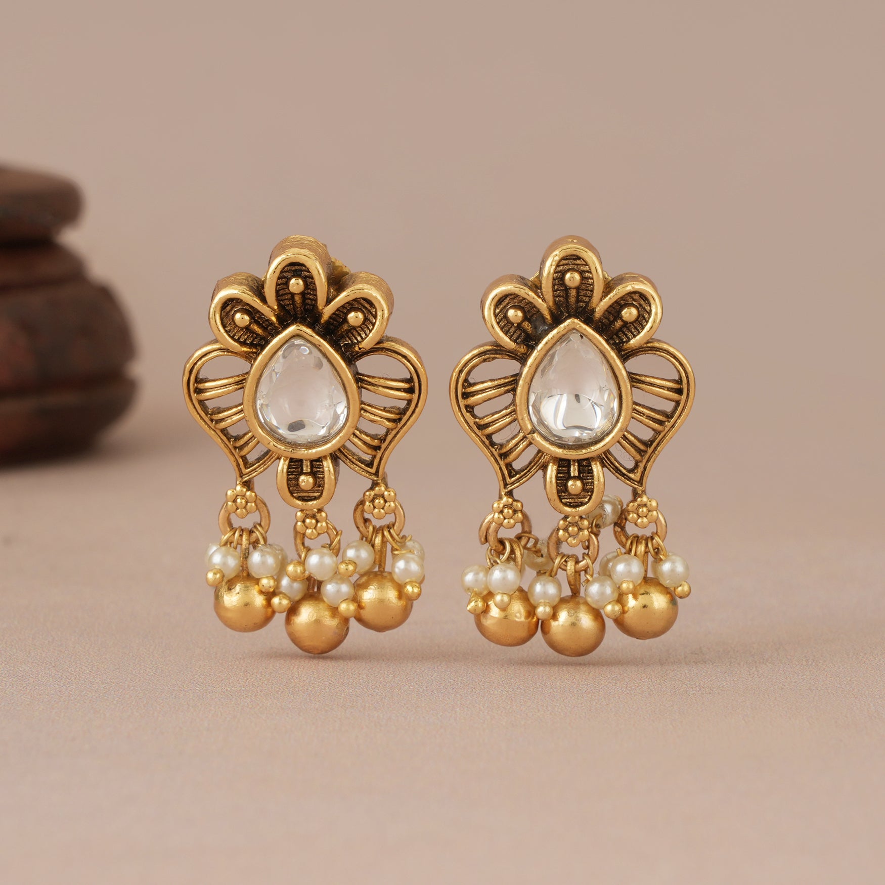 Cute elegant kundan antique earring for women   of brass alloy with gold plating. These earrings are  1.1 inches long, and the lock is push back. Cute elegant kundan antique earring for women   show-stopping and come in traditional  Indian   design with gold plating and handwork.